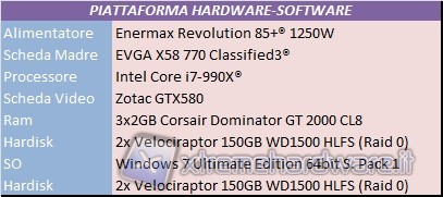 Abbiamo usato una piattaforma Intel basata sull’ultimo processore di fascia Extreme, precisamente il core i7-990X la cui recensione è disponibile a questo link. Vi elenchiamo di seguito i componenti hardware usati per i test: