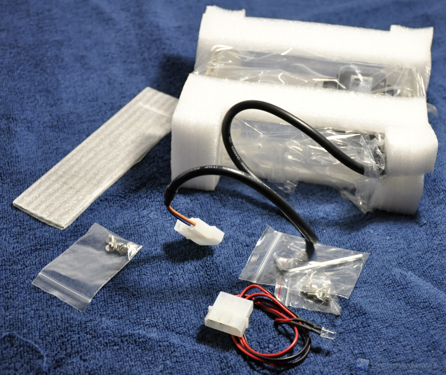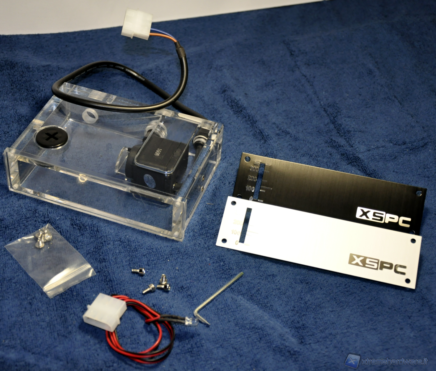 Come potete vedere dalla foto precedente, la cura nel confezionamento da parte di XSPC rasenta la perfezione. La vaschetta è racchiusa e protetta sia da due maschere di poliuretano espanso, sia avvolta da una bustina di cellofan trasparente. Insieme alla vaschetta potete vedere il cavetto con il diodo led per l’effetto ottico, la confezione rettangolare a sinistra con le 2 mascherine e le 3 bustine delle viti e della chiave a brugola.
