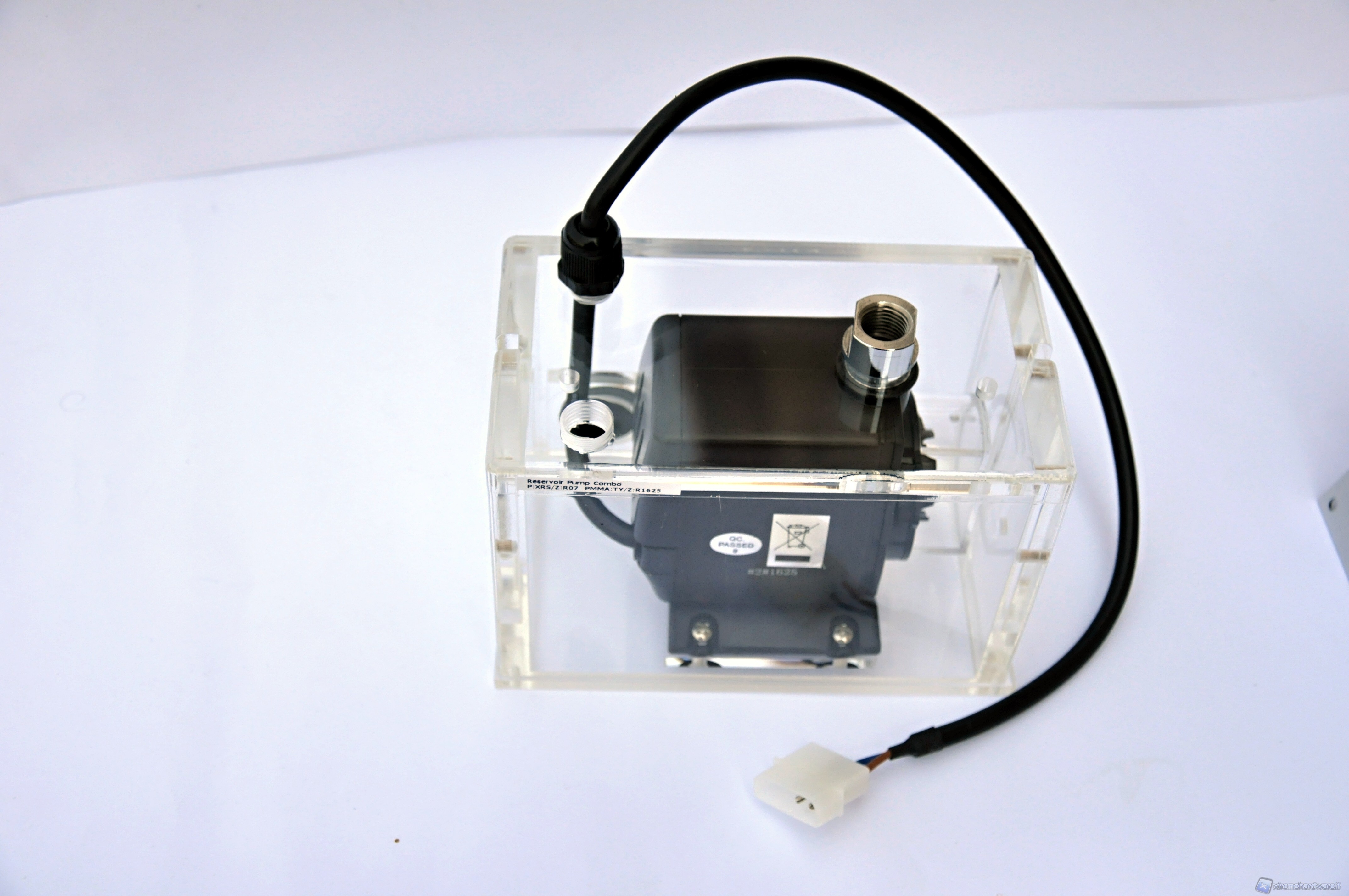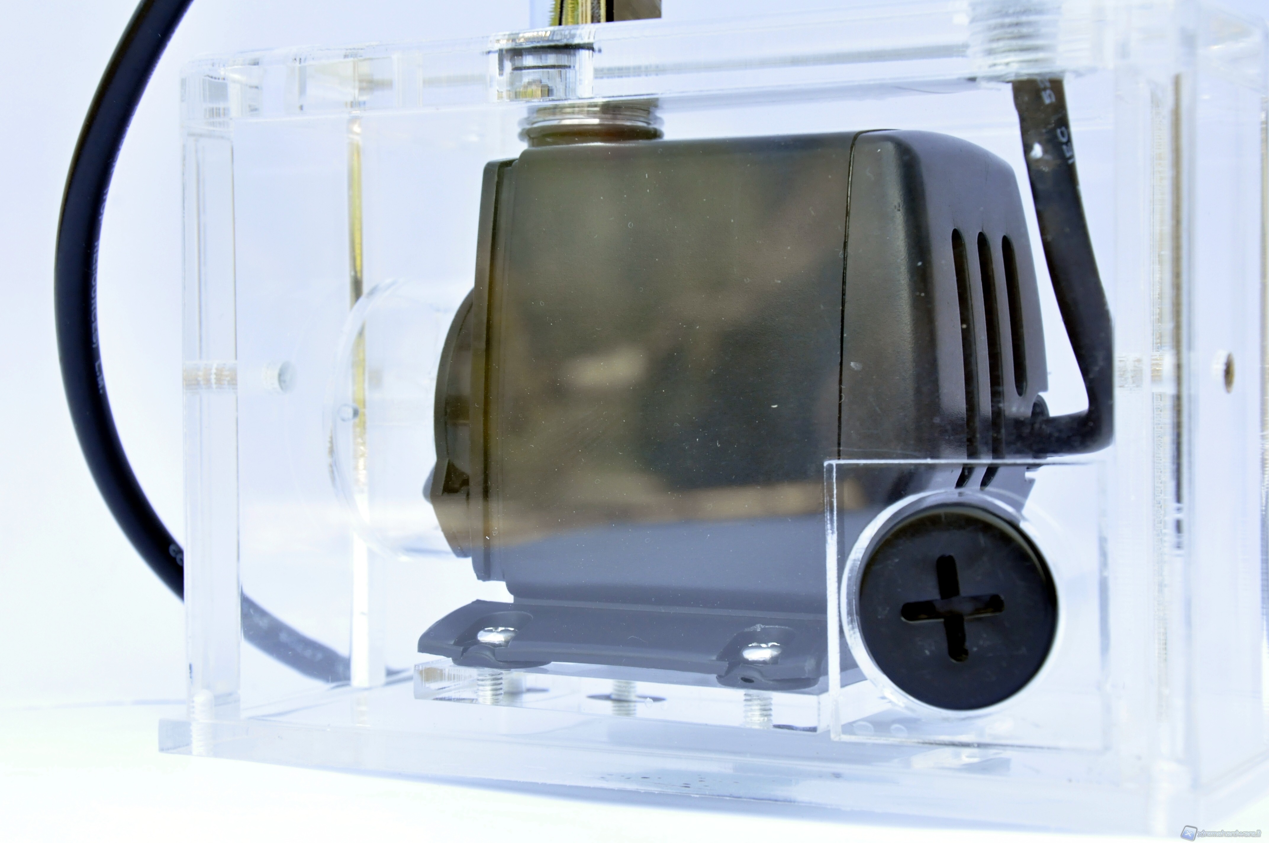 Il corpo della vaschetta dov’è racchiusa la pompa è in materiale acrilico trasparente. Relativamente alla foto che precede, le pareti frontale, posteriore e quella in basso (dove andrà attaccata la mascherina) hanno uno spessore di 6mm, mentre il resto delle pareti, quindi superiore e laterali hanno uno spessore di ben 13mm. Essendo la pompa inserita nella vaschetta, si evince immediatamente che essa è del tipo ad immersione ovvero lavora all’interno del liquido. Questo non deve trarre in inganno sul fronte delle prestazioni, mentre sull’aspetto della silenziosità, il fatto di essere immersa nel liquido e inserita in un corpo chiuso non può che favorire la riduzione delle emissioni sonore.