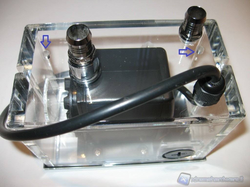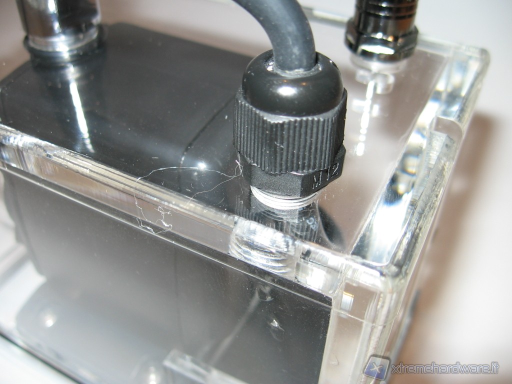La pompa a sua volta è fissata sia sulla base da 4 viti in acciaio, avvitate su una staffa sempre in acrilico fissata internamente alle pareti con della colla speciale, sia cima dalla boccola in acciaio cromato che in primo luogo la fissa alla parete superiore da 13mm ed in secondo luogo funge da raccordo passante e di attacco per l’uscita del liquido. Come potete notare dalla foto sottostante, una guarnizione o-ring funge da guarnizione alla boccola che presenta un foro filettato da G ¼.