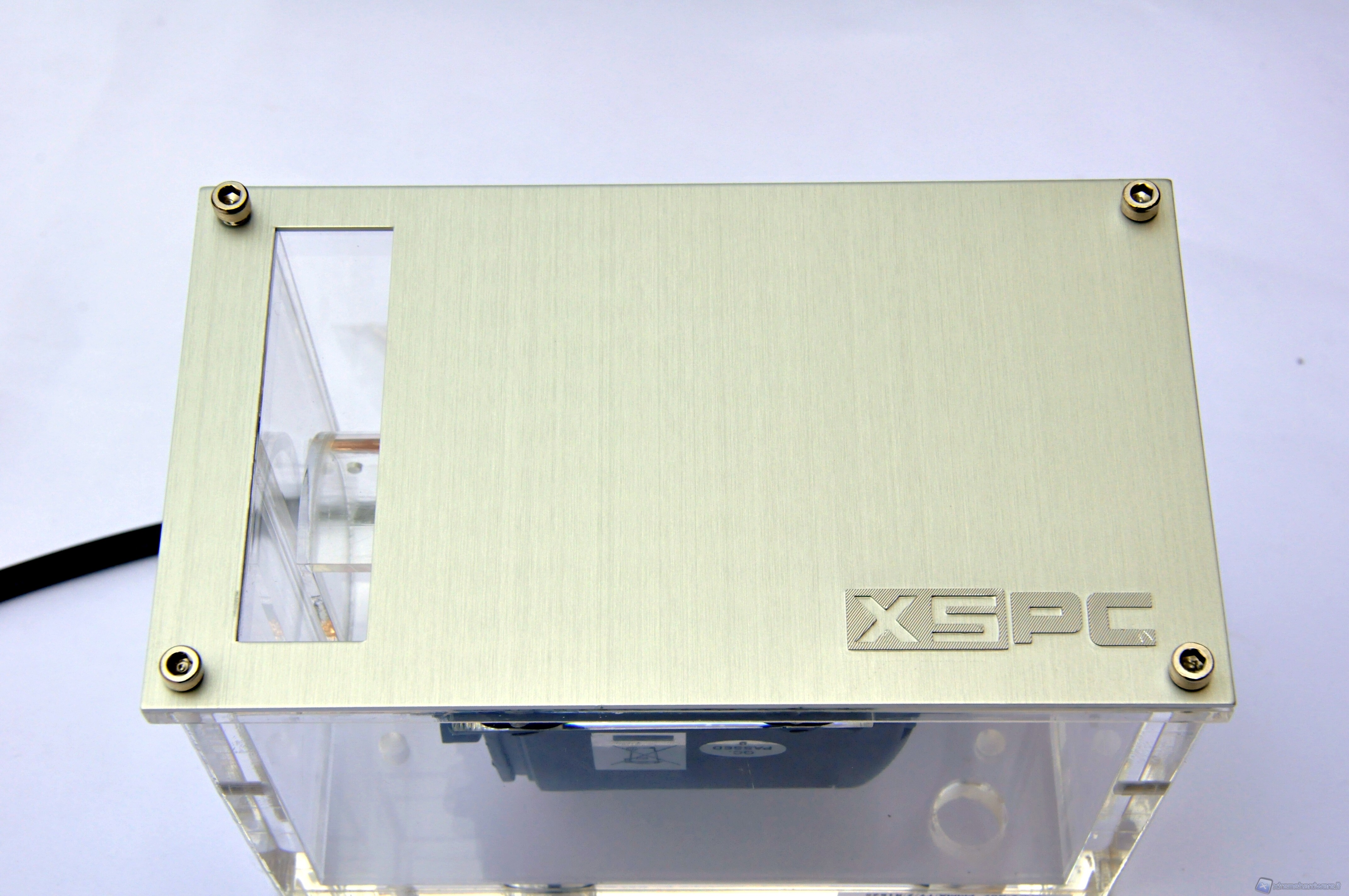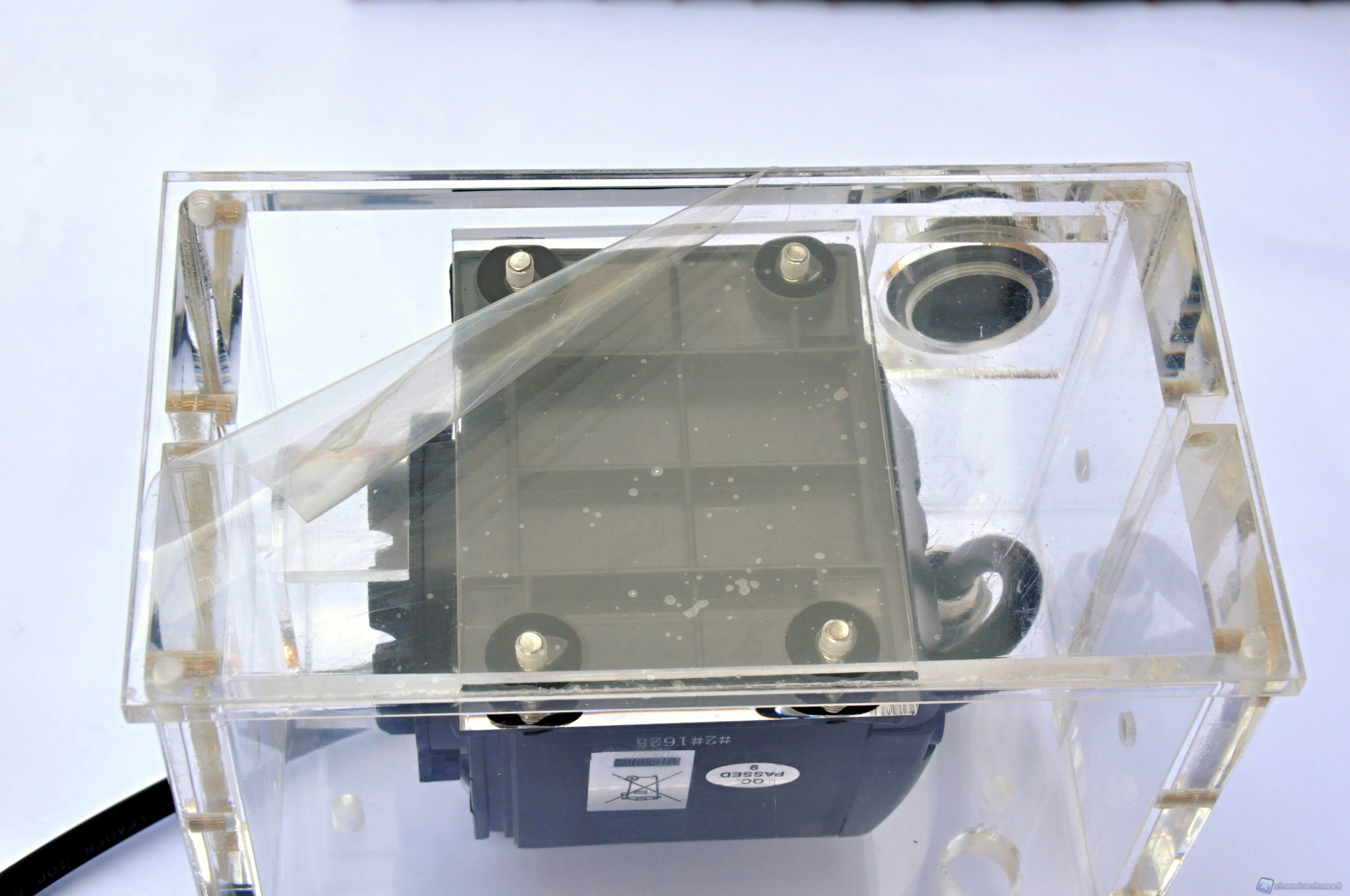 Tolto il foglio trasparente protettivo antigraffio, serriamo la mascherina al corpo vaschetta con le 4 viti fornite in dotazione tramite la chiave a brugola. Procediamo poi con il fissaggio dei 2 raccordi, noi abbiamo scelto due raccordi da 13mm della Phobya. Agganciati i tubi e serrati con delle fascette si può procedere all’inserimento della vaschetta nel vano predisposto, ma senza fissarla, poiché bisognerà rabboccare il liquido quando il livello scenderà per effetto del riempimento del circuito. Consigliamo per i meno esperti di eseguire una prova di tenuta del circuito provandolo esternamente al computer. Per l’avvio dell’alimentatore senza il sistema, e quindi della pompa, basterà cortocircuitare i cavi di colore verde e nero come indicato in questa pagina sul nostro forum.