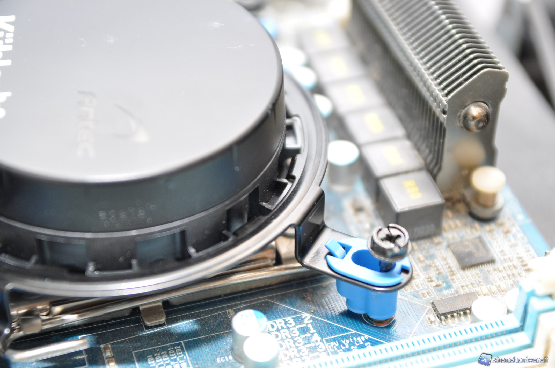 Poi posizioniamo la staffa anteriore, facendo attenzione a piazzare correttamente i bloccanti di colore blu per i socket INTEL. Serriamo ora le viti quel tanto che basta per tenere la struttura ancorata.