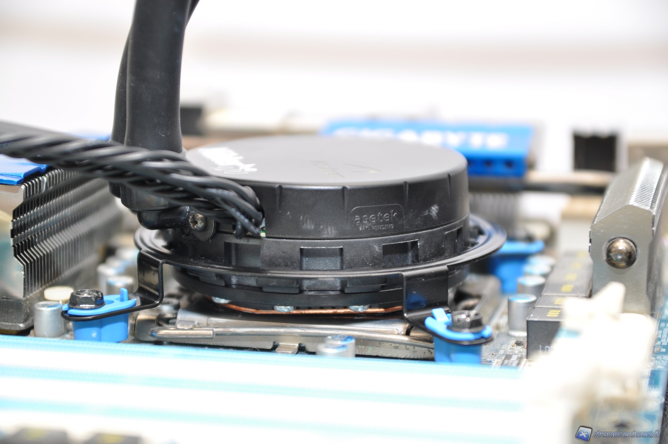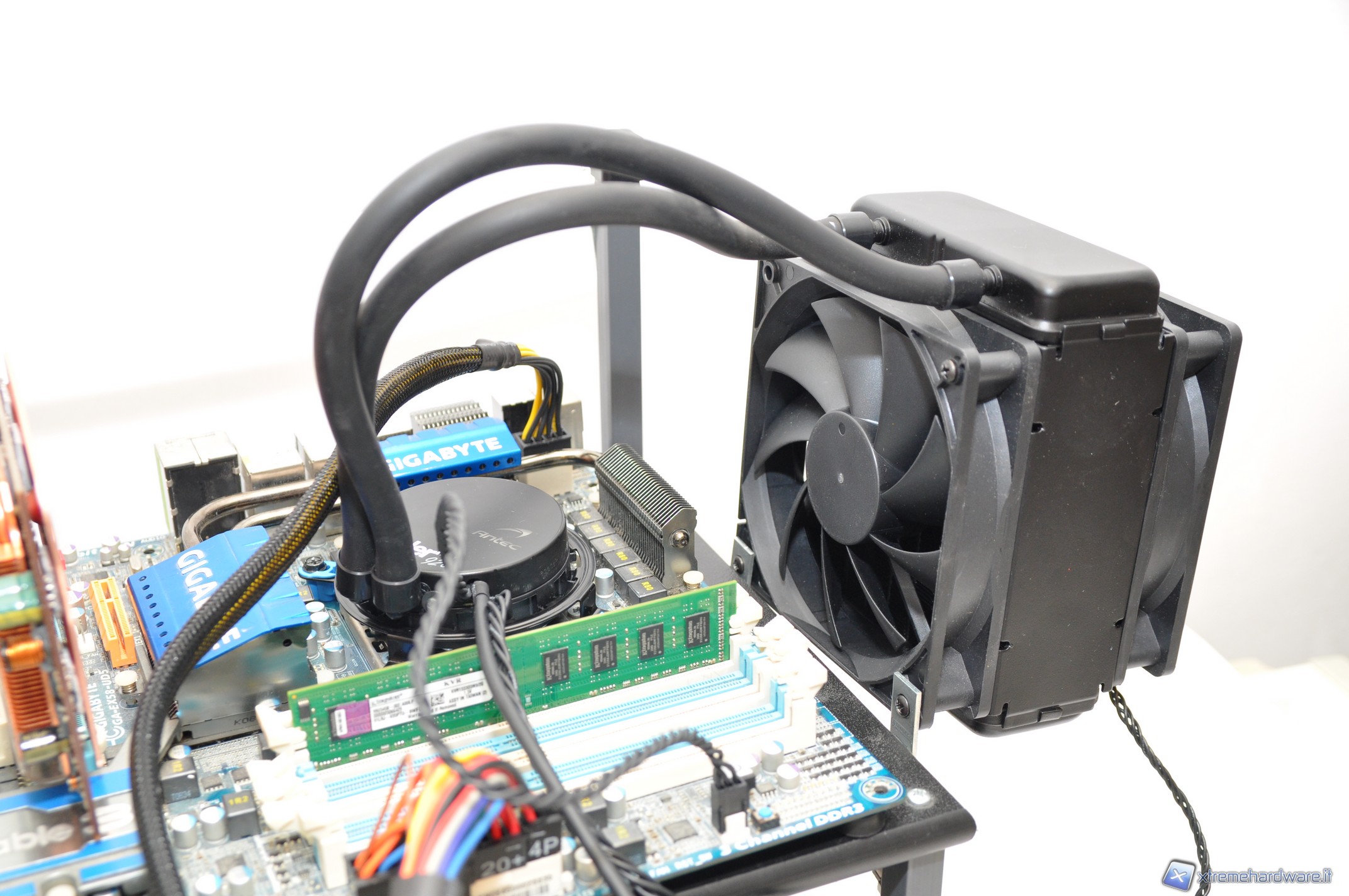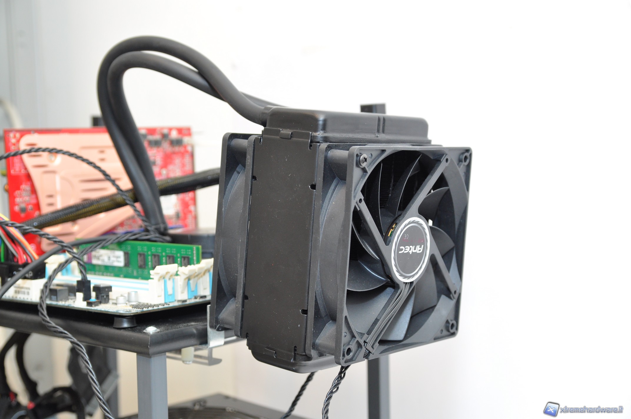 Questo sistema non presenta il problema derivante dalla rotazione del waterblock sulla pasta termica, presente invece sul Corsair H50 compromettendone in parte le prestazioni. Durante questa fase assicurate il corpo radiante in qualche posizione stabile, evitando oscillazioni e urti pericolosi all’interno del case che potrebbero danneggiare l’hardware installato (la posizione orizzontale del case è probabilmente quella meno pericolosa da questo punto di vista).