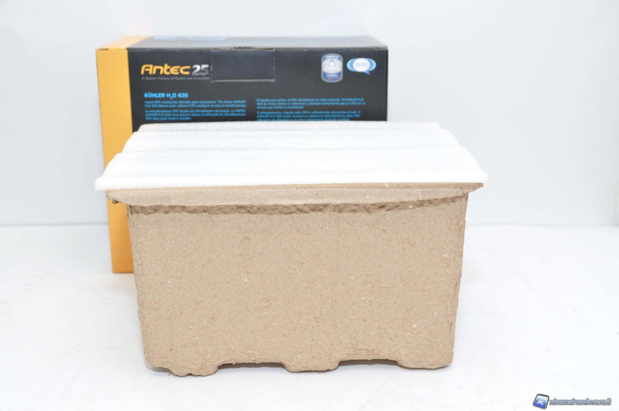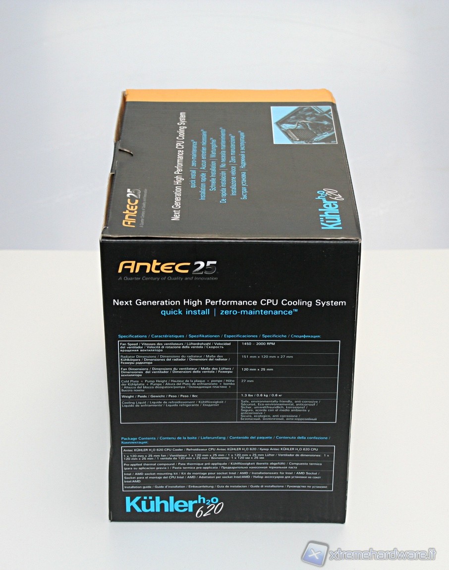 Il dissipatore, diversamente da altre soluzioni della concorrenza, è racchiuso in un particolare confezionamento derivante da sostanze riciclate, similmente a soluzioni di proprietà Sapphire. Ciò rende possibile ovviare in parte ai seri problemi derivanti dagli imballi di prodotti informatici, che per la loro natura inquinante sono problematici nello smaltimento. Tra gli obiettivi principali di Antec troviamo, infatti, il rispetto per l’ambiente. La scatola esterna, di forma rettangolare, è molto rigida ed all’esterno sono riportate tutte le informazioni necessarie, persino dei test specifici realizzati su una CPU Core i7 980.