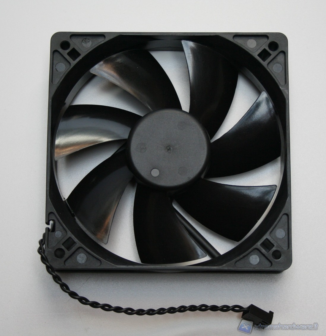 Terminata questa velocissima procedura, posizioniamo il radiatore nella feritoia da 120mm posteriore del case, e inseriamo le prime 4 viti passanti dall’esterno, attraversando la prima ventola per agganciarle al radiatore. Una volta serrate le viti dall’esterno, possiamo inserire internamente una seconda ed ipotetica ventola, e fissarla con le restanti viti. Connettiamo infine il connettore a 3 pin alla scheda madre.