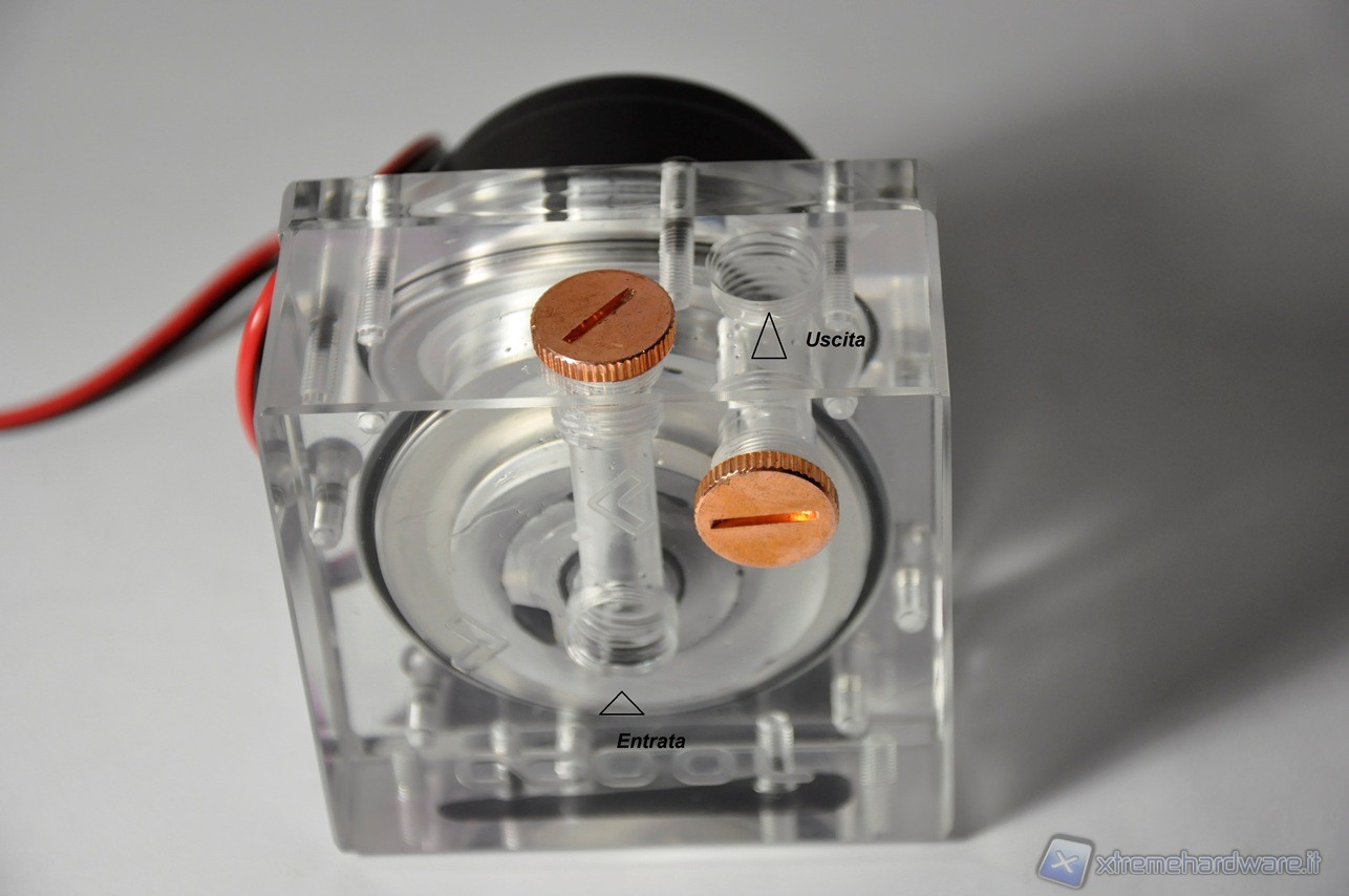 Essendo una pompa rotativa, il liquido uscirà per effetto della forza centrifuga. Come abbiamo visto, la pompa ha doppi fori, sia d’entrata che d’uscita, per cui può essere utilizzata per sdoppiare il circuito CPU-VGA. L’importante è collegare il circuito al foro d’entrata della pompa, a valle della vaschetta, per far in modo che sia sempre alimentata da liquido, viceversa si rovinerebbe in breve tempo dato l’elevato regime di rotazione. La pompa è alimentata a 12 volt tramite il cavo molex fornito in dotazione.