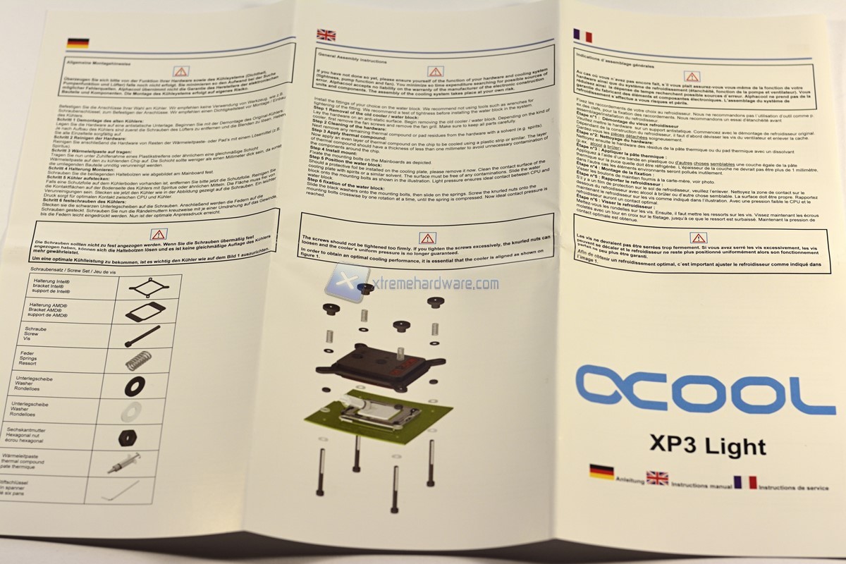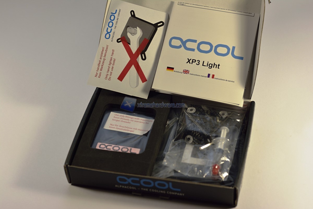 La confezione si presenta al tatto robusta, la maschera di poliuretano mantiene fermo il waterblock da eventuali danni accidentali che possono verificarsi durante il trasporto separandolo dalle altre parti ferrose quali viteria e staffe. Il dépliant in più lingue elenca le parti presenti nella scatola e l’esploso per il corretto assemblaggio.