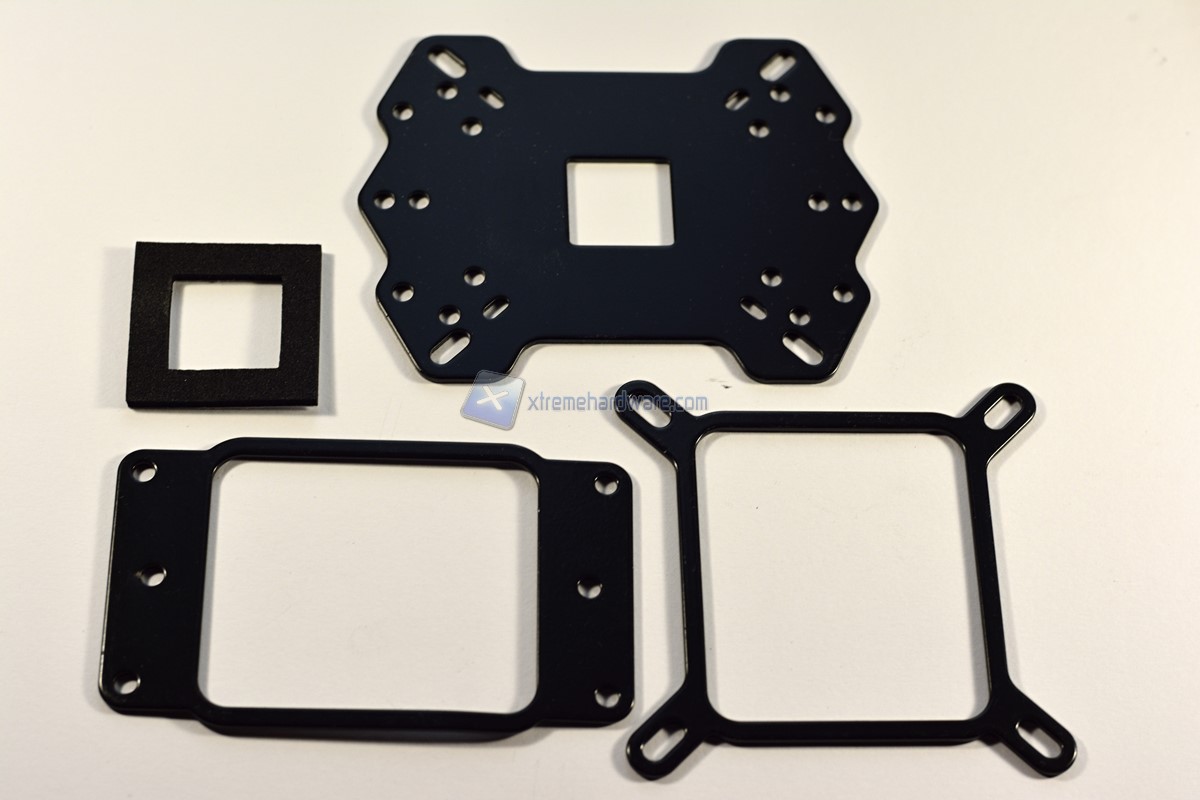 Come riportato sul sito del produttore, il waterblock è compatibile praticamente con tutti i socket sia Intel che AMD grazie alla presenza delle apposite staffe, a sinistra per socket AMD ed a destra per socket Intel. La prima in alto guardando la foto funge da staffa di fissaggio e ritensione per la parte sottostante il socket, per evitare che il PCB della motherboard si fletta per l’azione della pressione delle molle che spingono il waterblock sulla CPU.