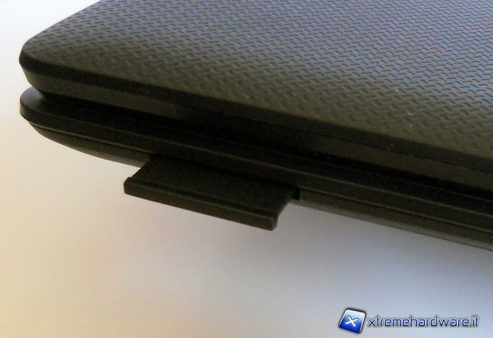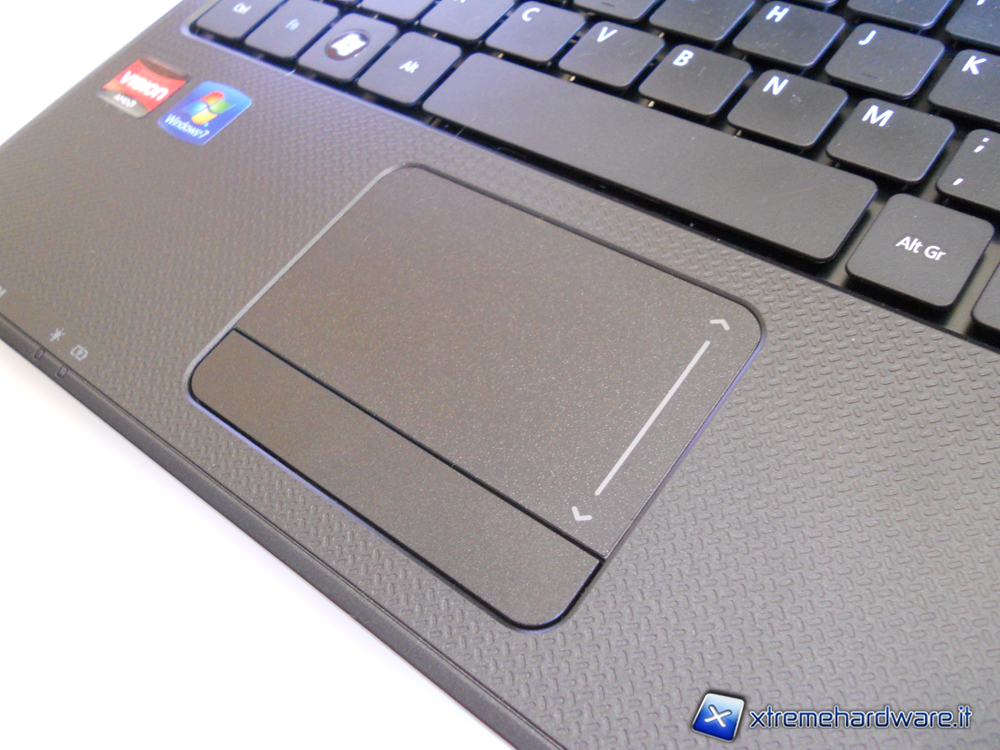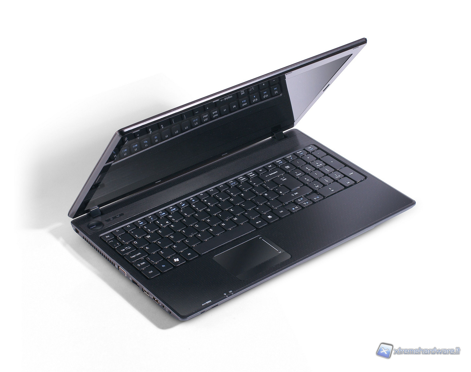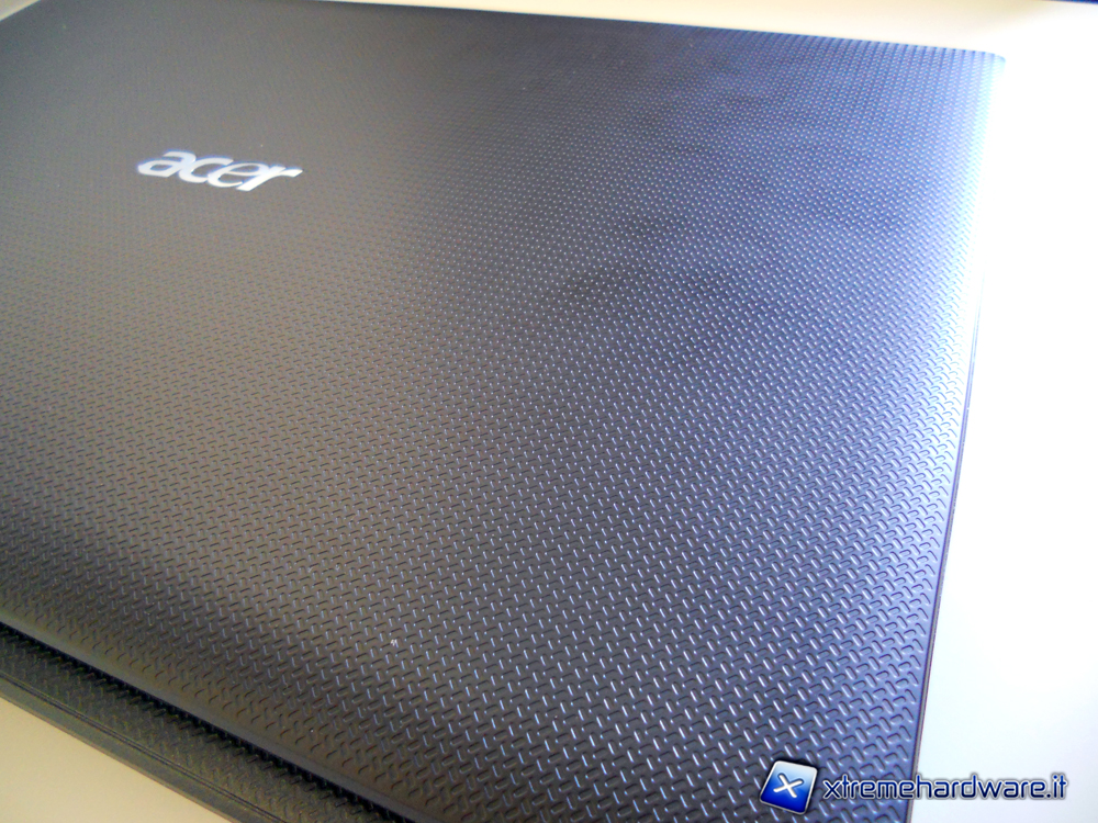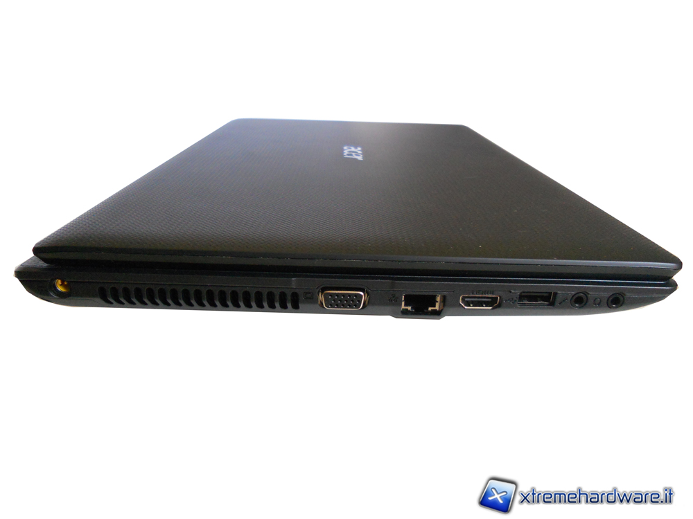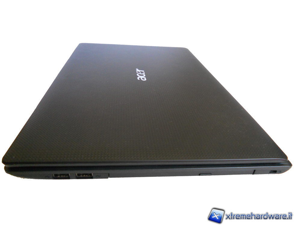 Externally, the Acer laptop is very elegant and with fairly small size. The body, entirely of black plastic, has in the upper part a very simple texture, but that makes it very aggressive; in the central part there is also the chromed Acer word. The same top side texture is also visible at first opening of the PC. Externally there are three USB 2.0 ports, one HDMI, one VGA, one Ethernet LAN 802 11b/g/n, two jacks to connect headphones (or speakers) and microphone, and finally the power connector. Space is also reserved for a DVD-Super Multi DL optical drive and the 2-in-1 SD and MMC card reader.