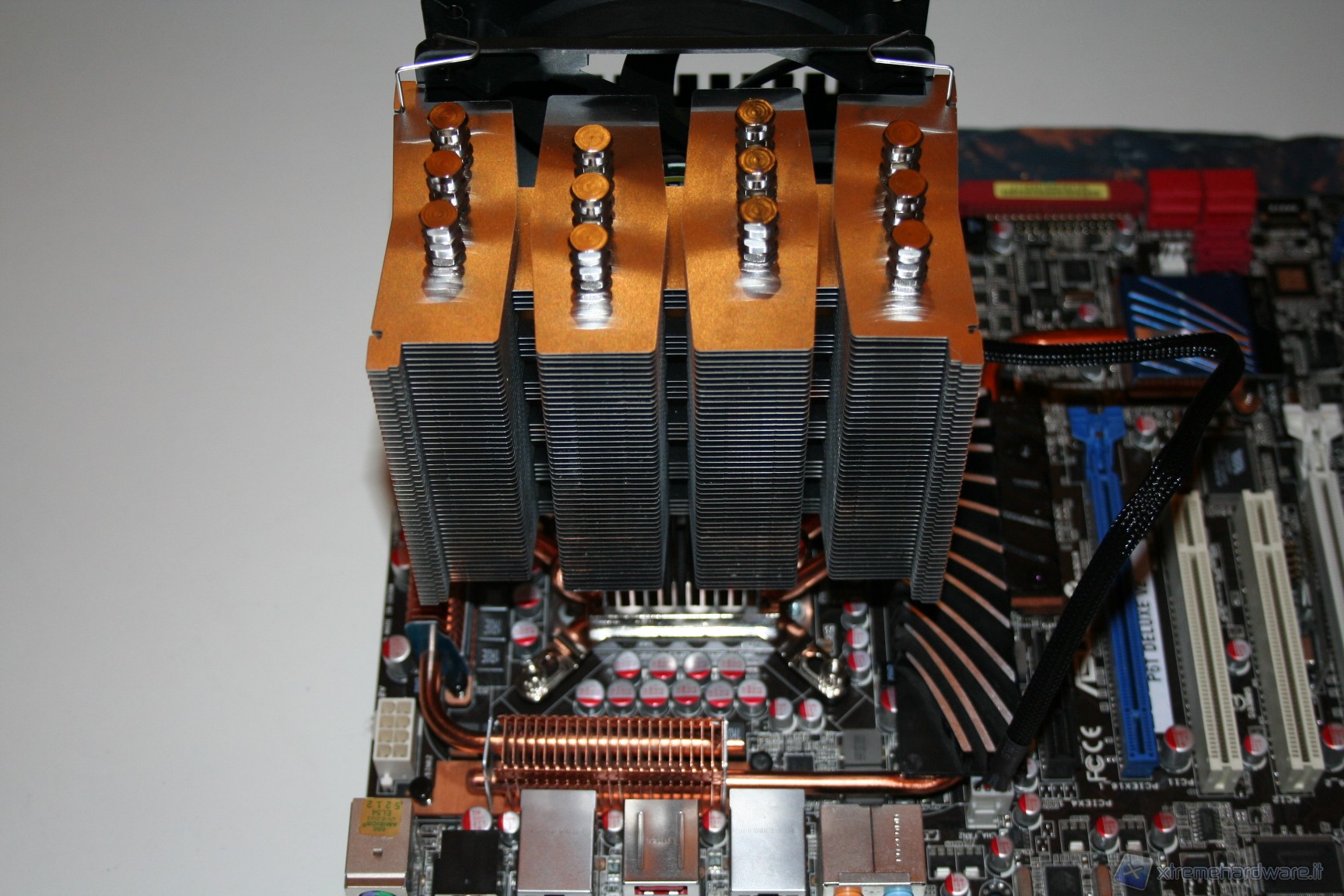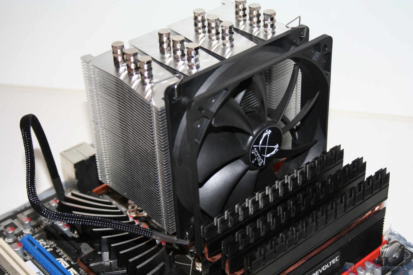 As Scythe usually grants, installation is easy and everything is very stable, once the operation is complete. The only negative note, although the overall compact size, is that if you mount the 120mm fan in push, which comes as factory default, you will occupy the first slot of RAM. However, there is the possibility to mount the fan in a pull configuration (extraction) in the back of the heat sink.In doing so, anyway, you can have a slightly worse performance but of course makes it possible to populate all six slots of RAM available in a LGA 1366 configuration. We note also that the installation was done on an ASUS P67 Deluxe V2: in other motherboards, such as the Gigabyte X58-UD5 , where the distance between slots and the socket is shorter, the fan could interfere also with the second slot instead of just the first.