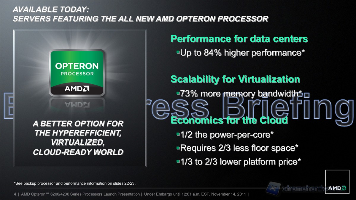 Efficiency and economy for the cloud and virtualization: half power per core than the best Xeon (4.375W against 10W), 2/3 less space for the same core (2P rack systems can accommodate 12 Intel cores against 32 AMD cores) and finally 1/3 to 2/3 less in retail price for TOP of the range AMD complete server solutions against Intel’s.