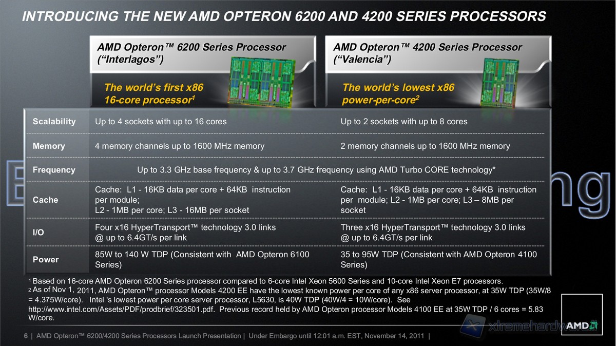 The solutions of the 6200 Series double the 4200 series features, being based on two dice in MCM configuration, with solutions from 4 to 16 cores, arranged in modules, with 64KB L1 instruction cache per pair of cores, 16KB L1 data cache per core, 2MB of L2 cache per pair of cores and 16MB total L3 cache per socket, with solutions of two to four-socket, four DDR3 1600MHz channels per socket, four HT links x16 3.0 per socket, up to 6.4GT/s and frequencies up to 3.3GHz, base, and 3.6GHz with maximum turbo core, with solutions from 85 to 140W consistent with the previous 6100 series, being installable, after updating the BIOS, even in existing systems.