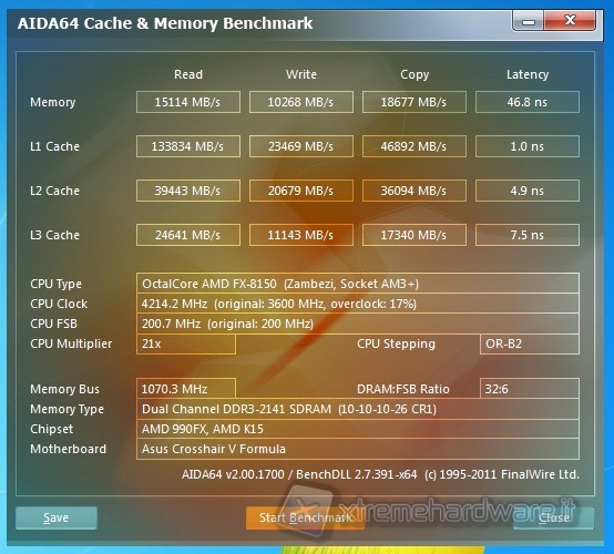 The reference software we primarily used was AIDA64, where we analyzed the bandwidth of read, write, copy and access times to memory. The second software is WinRar 4.01 (stable version), which typically can achieve good performance increase with faster memory. The last software we used is Cinebench R11.5, where we checked the score on the multi-core.