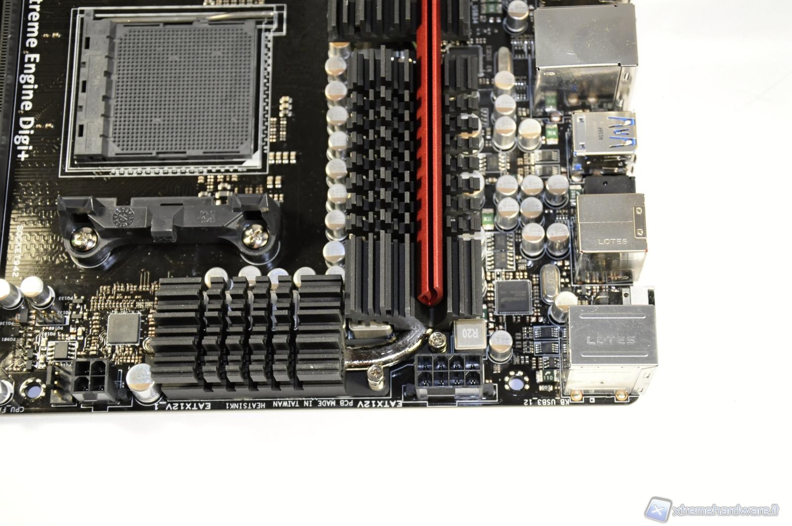 The layout is very neat and innovative and is separated from the traditions so far followed. While the color scheme is classic and always found in other ROG models, a clear advantage in terms of space around the socket is visible on the ASUS Crosshair V Formula . The availability of space on one hand makes more permissive in the choice of the heat sink for the CPU and the other hand let you use a simpler and more effective insulation when you run them under cold overclocking tests. Surely you've noticed that the area at the left of the socket is free and is devoid of classical cooling flange covering the 990FX because that was moved over on the same horizontal line of the power dissipation of the chip, connected by a central channel of Heat Pipe to maximize the dissipation of heat from warmer areas to cooler areas.