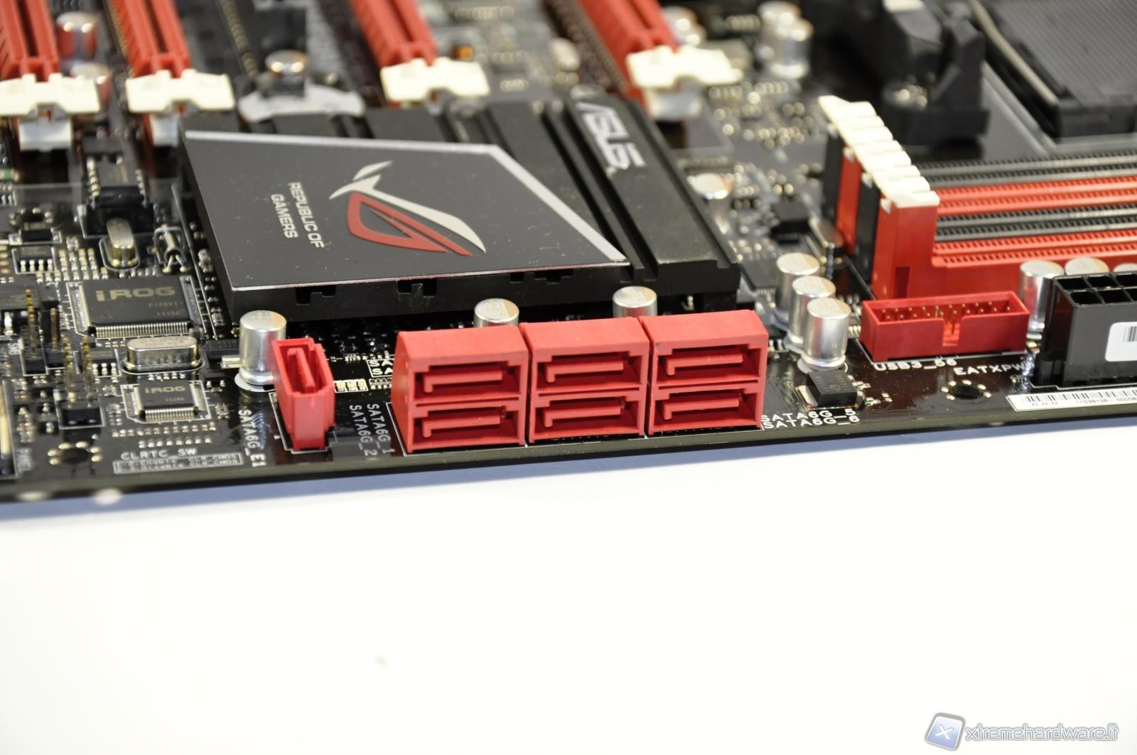 The number of USB ports is remarkable, distinguished by color depending on the speed of connection and origin. One of the black ports, can be converted for use with ROG Connect, while we note the absence of a FireWire port and a second LAN port. Instead, from left, below the 2 USB ports group we have 1 e-SATA port. To end the blockade of ports, all the I/O sockets reserved for audio signals.