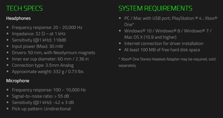 Come possiamo leggere anche dalle specifiche tecniche nulla è cambiato eccezion fatta per alcuni valori relativi al Microfono. Avremo infatti una Sensibilità a 1 kHz di -38 +/- 3 dB per il modello Wireless e range di -42 +/- 3dB per il modello Wired. Anche il rapporto segnale/rumore passa da più di 60 dB nel modello Wireless a più di 55 dB per quello Wired. Insomma ci troviamo di fronte la ‘’fotocopia’’ detto in termini buonistici del modello Wireless. Naturalmente con il modello Wired perderemo la possibilità di utilizzarle senza cavi di torno e di usufruire del sistema Razer Chroma assente in quello Wired.