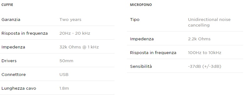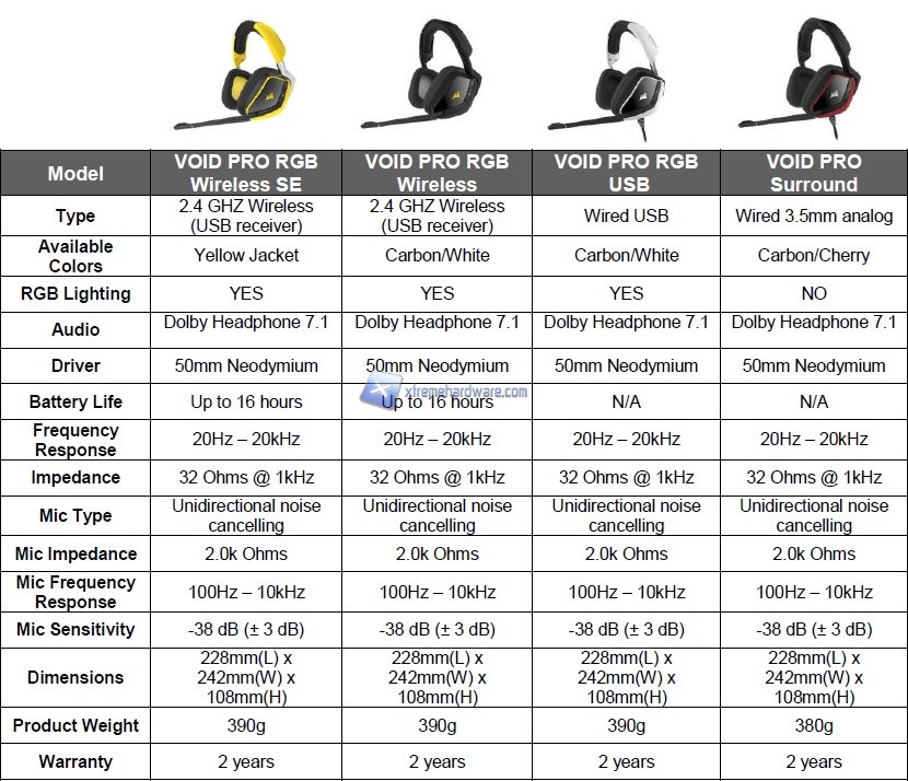 Vi riportiamo anche una tabella comparativa tra i modelli della serie VOID PRO di Corsair.