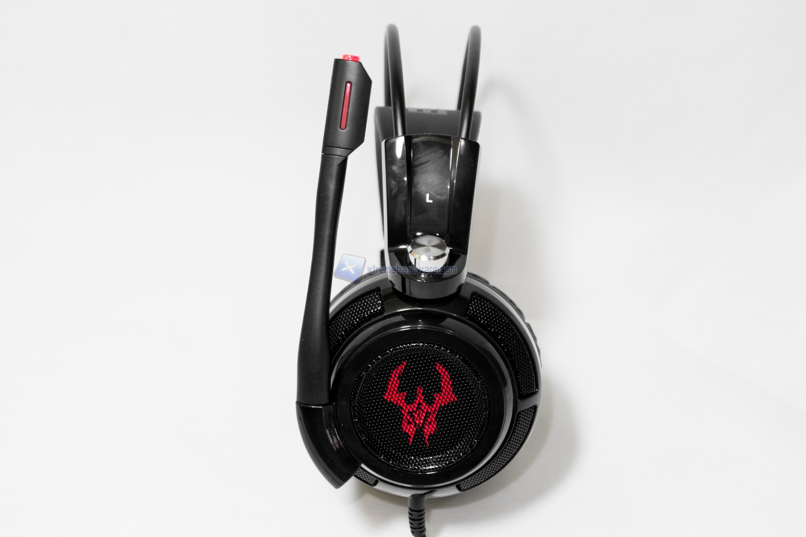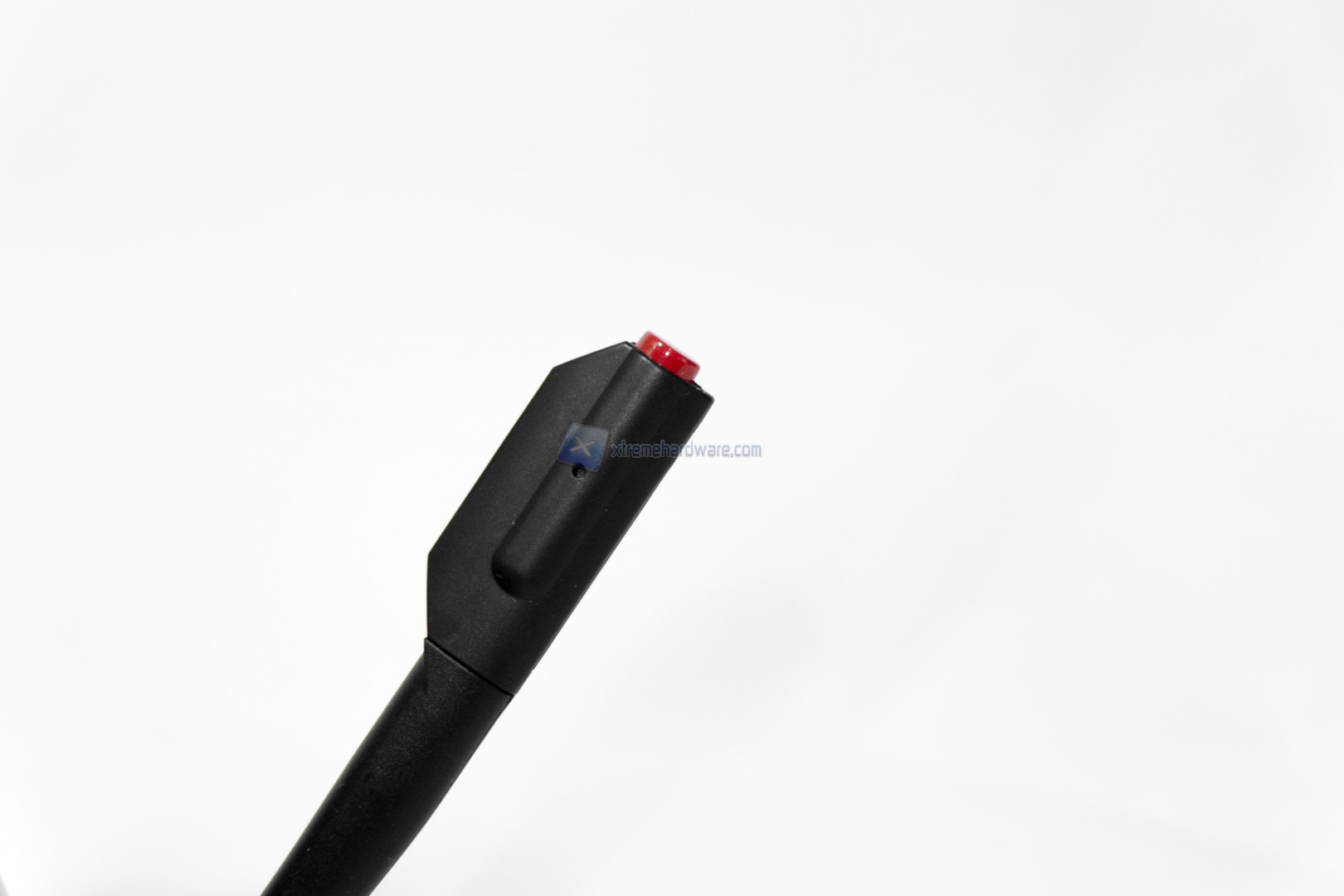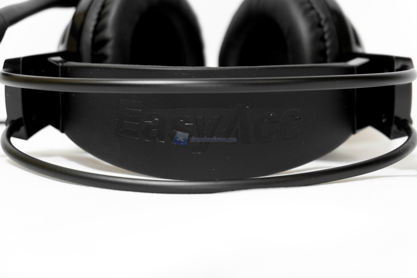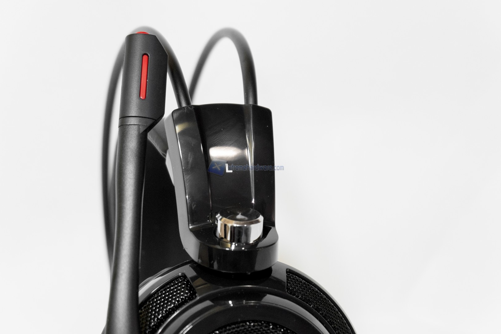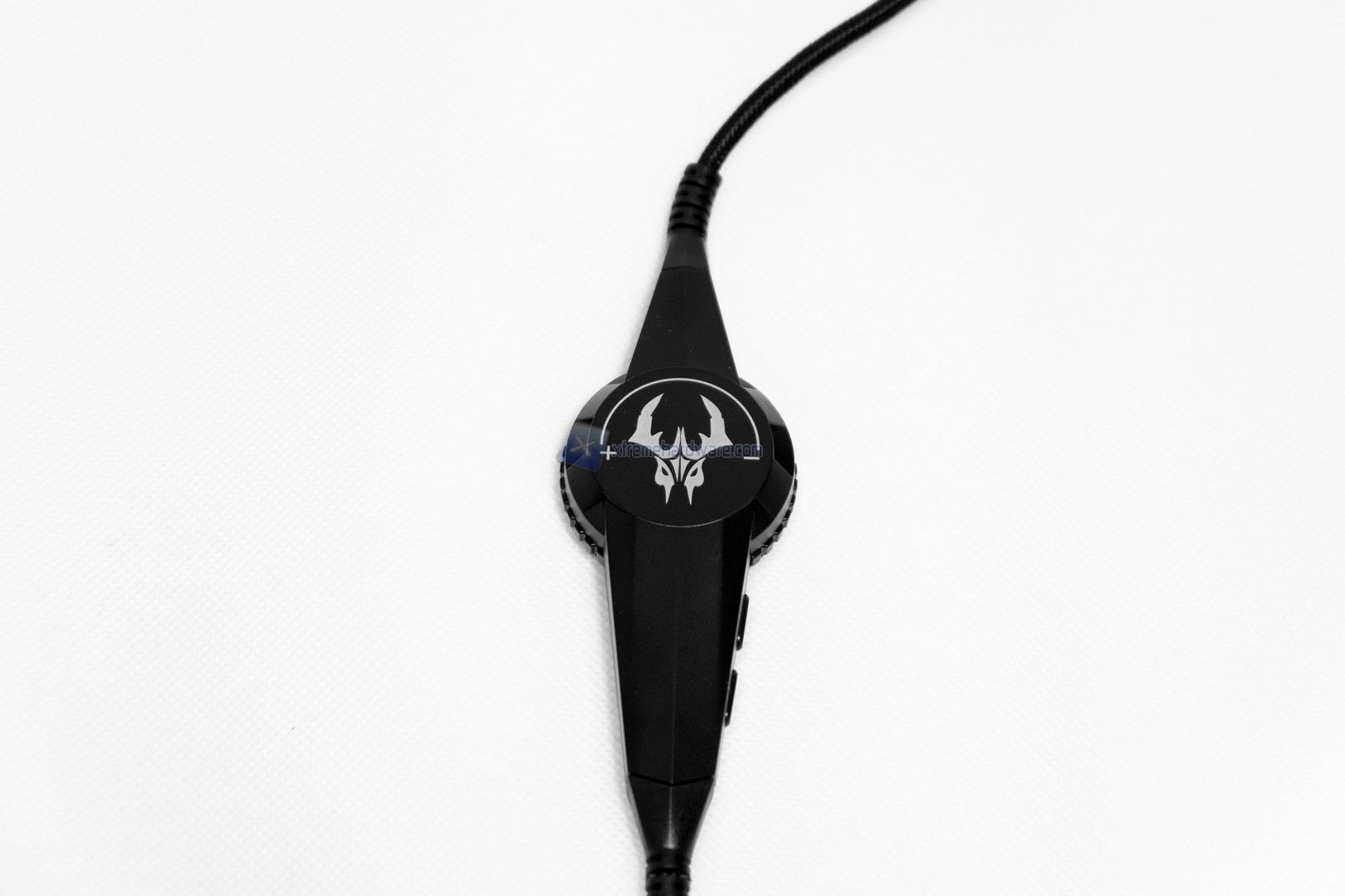 La zona esterna dei padiglioni auricolari delle G1 è caratterizzata da un design molto aggressivo, infatti oltre alla plastica lucida di colore nero troviamo anche una griglia metallica, che nasconde il logo gaming di EasyAcc retroilluminato di rosso quando le cuffie sono in funzione. I padiglioni possono adattarsi leggermente alle orecchie grazie a piccoli movimenti basculanti, sia orizzontali che verticali, quindi saranno in grado di adattarsi abbastanza bene alla nostra testa. Nel padiglione di sinistra troveremo il microfono omnidirezionale in gomma, a cui possiamo far assumere diverse posizioni, in grado di essere sollevato se non viene usato. Il microfono presenta un led rosso sulla sua estremità, che si accende quando colleghiamo le cuffie al nostro PC.