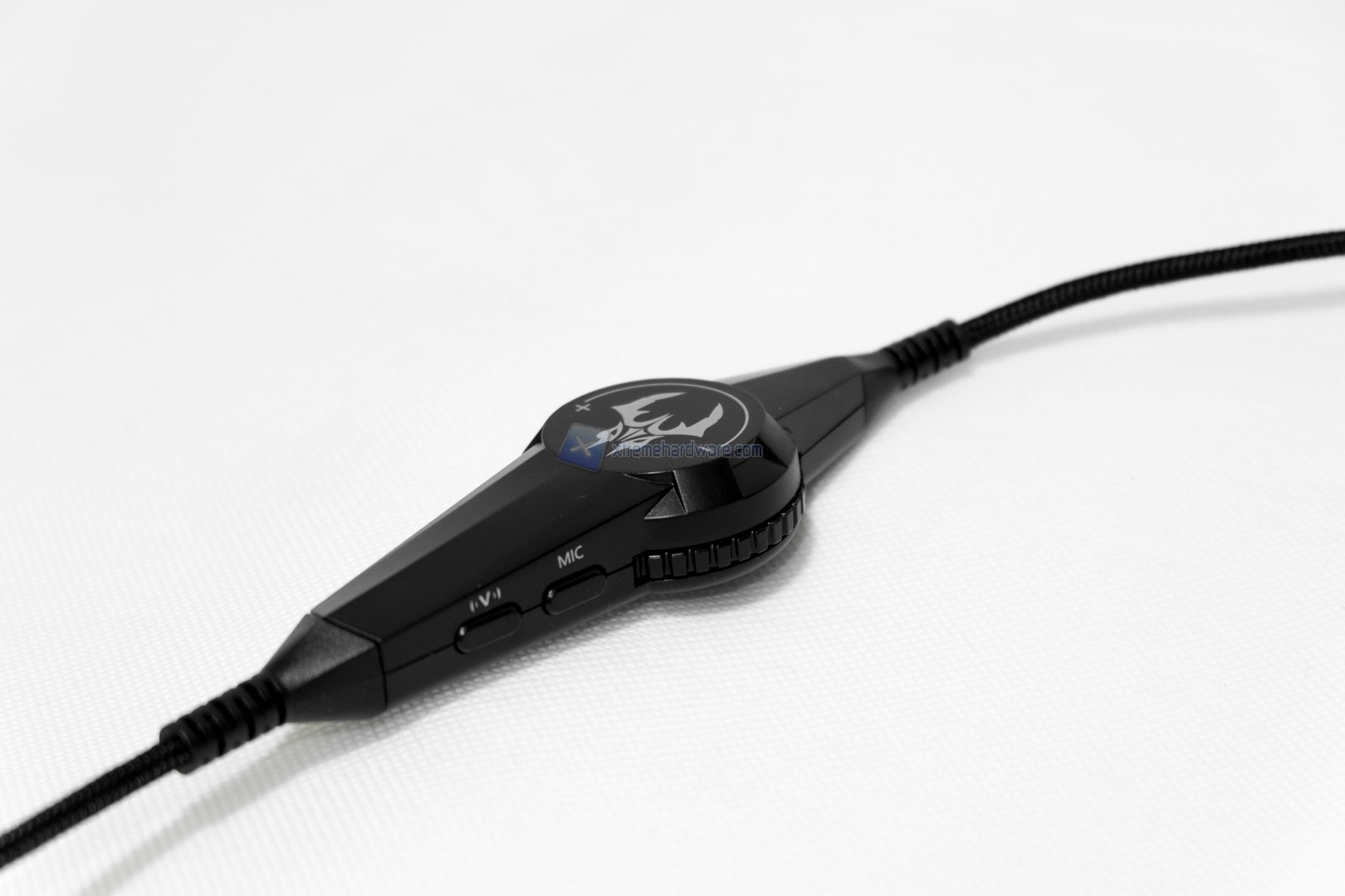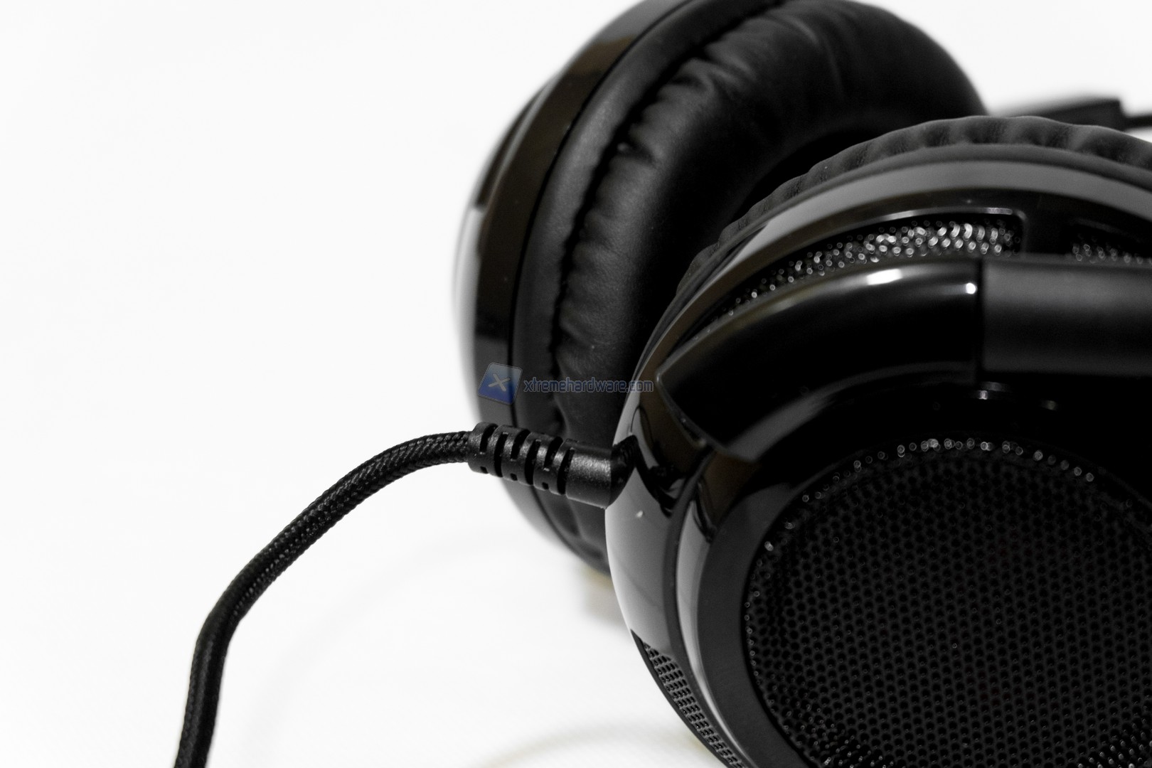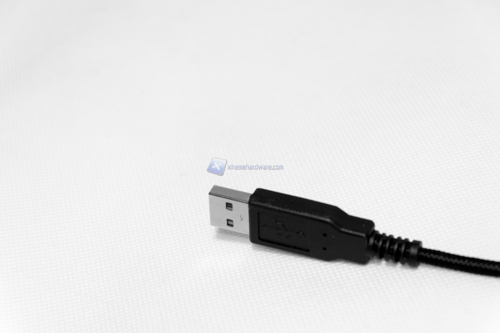 Le G1 si connettono al nostro PC grazie ad un cavo di 2 metri rivestito in treccia di tessuto, dotato di un piccolo controller su filo per regolare volume, muto microfono e effetto vibrazione. All’estremità del cavo troviamo il connettore USB purtroppo non placcato in oro.