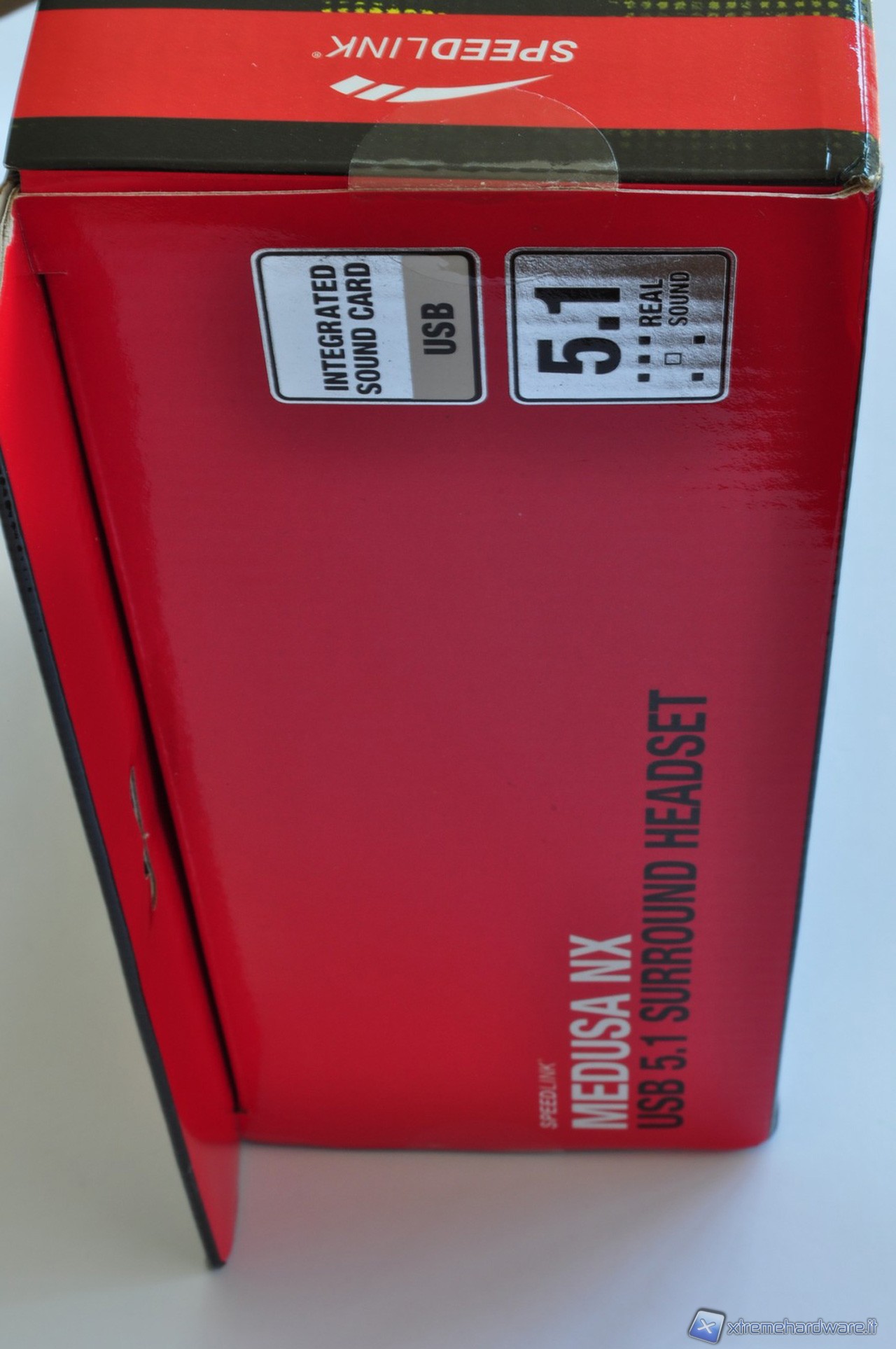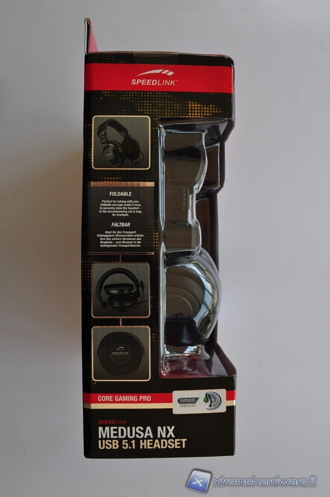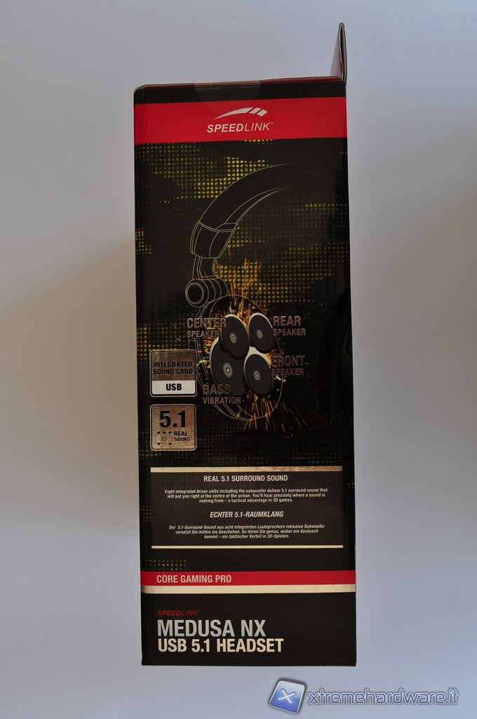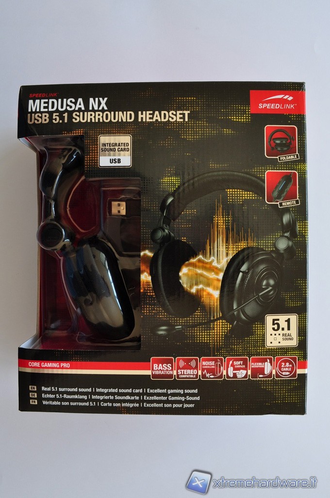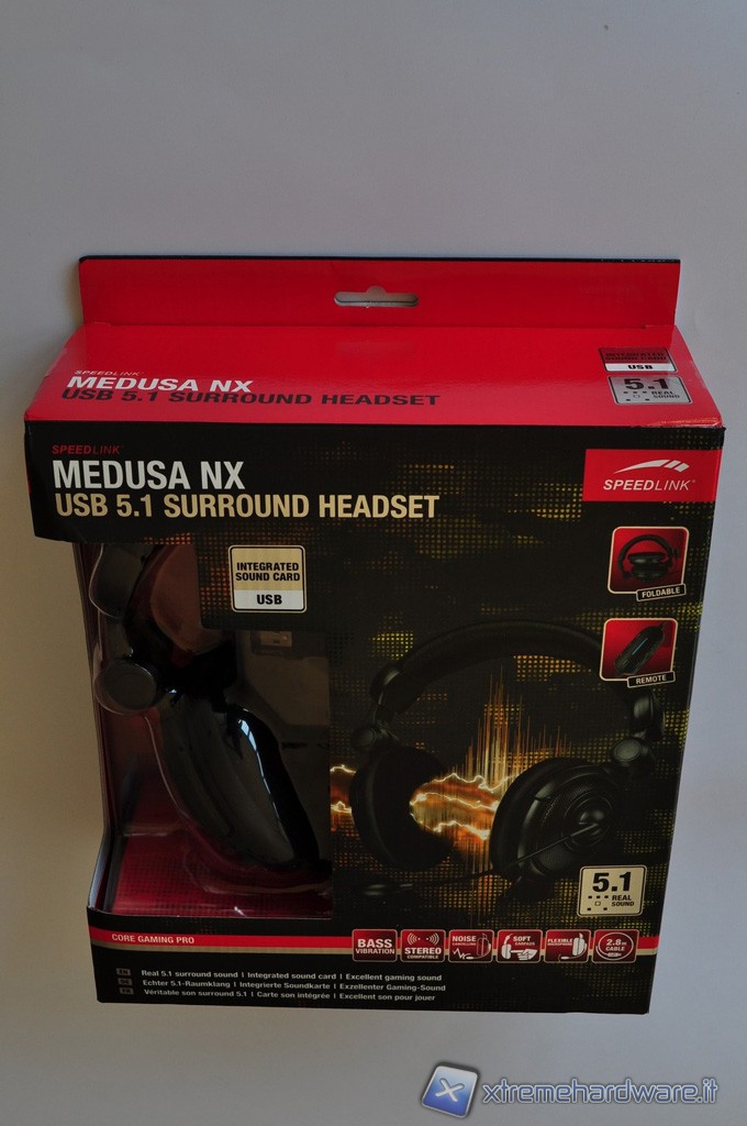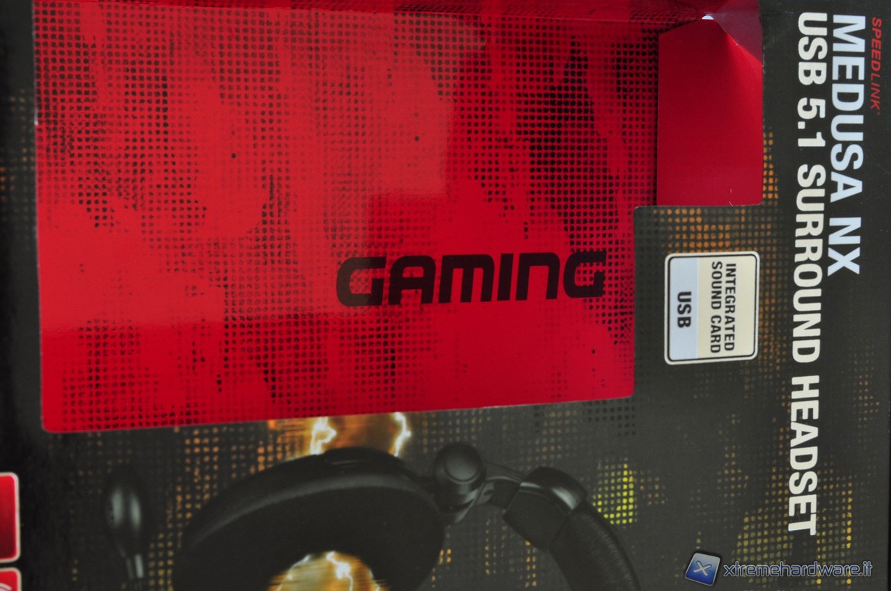 La scatola in cartone rigido plasitificato che racchiude le cuffie Medusa NX USB 5.1 Surround, presenta una grafica piuttosto accattivante. I colori dominanti sono il nero, il rosso ed il bianco, che si combinano in un gioco di figure e pattern dall’aria piuttosto aggressiva, in maniera tale da non far passare inosserata la confezione in qualsiasi scaffale. Una parte della scatola è aperta per lasciare in bella mostra il proprio prezioso contenuto che rimane protetto però da un involucro in plastica semi-rigida trasparente.