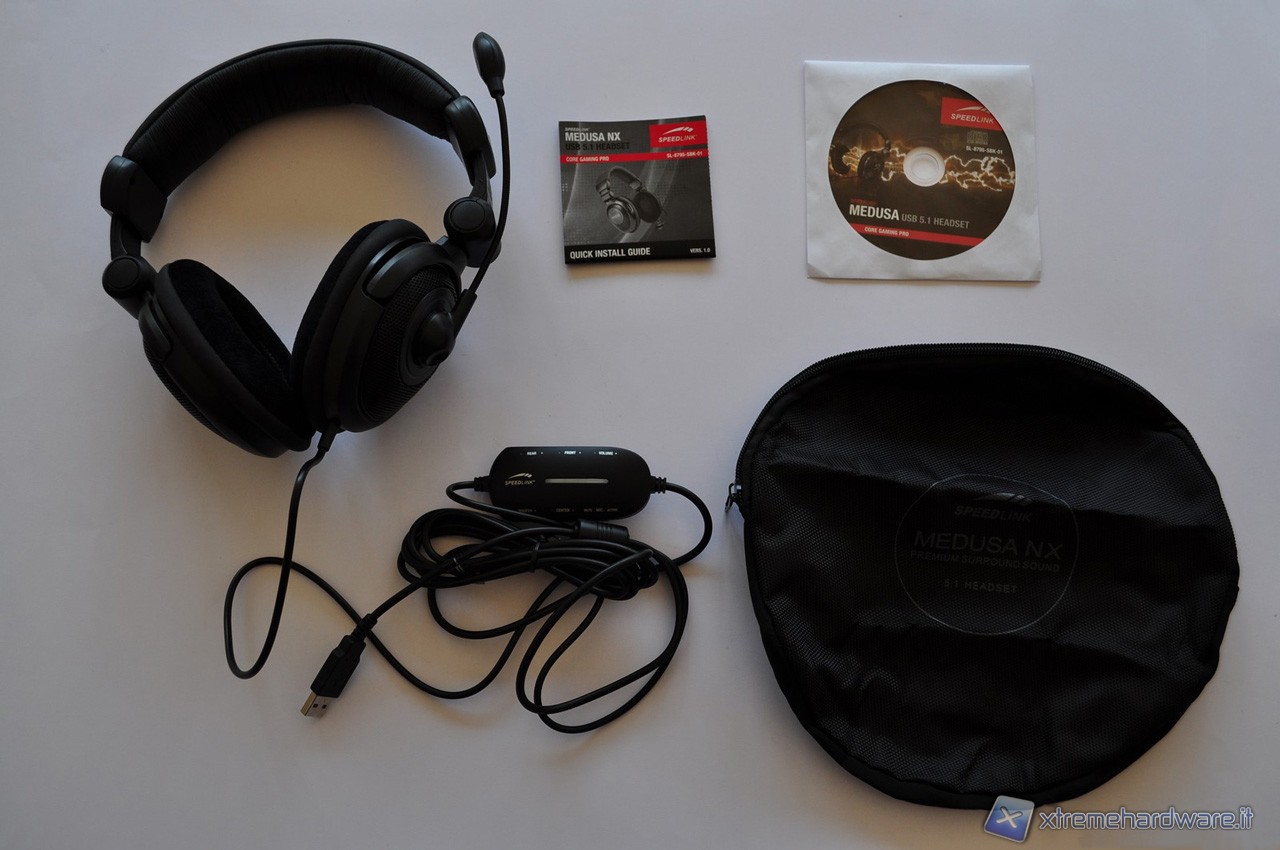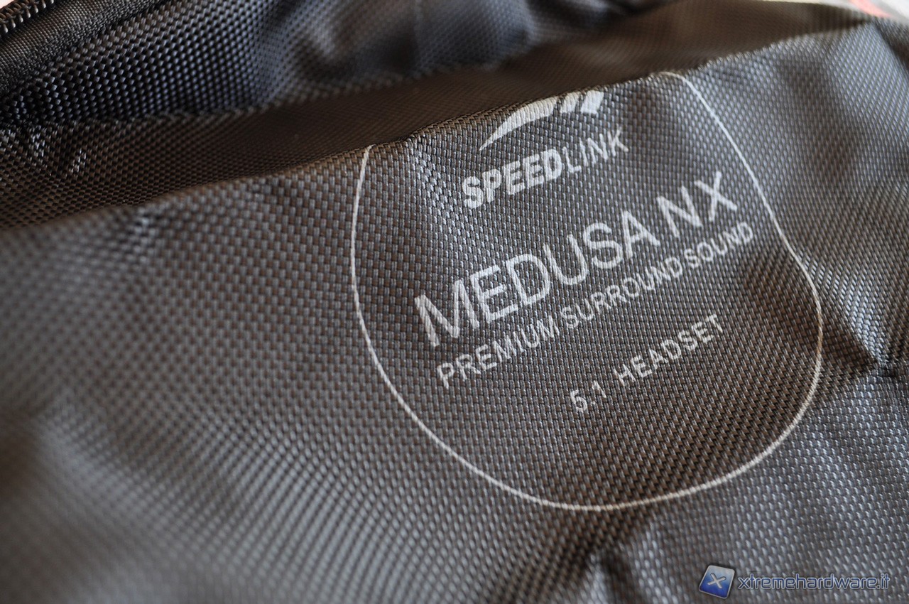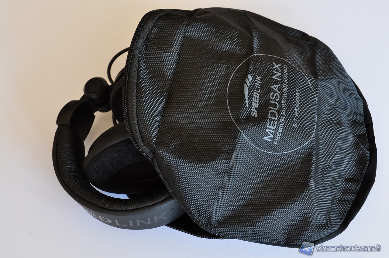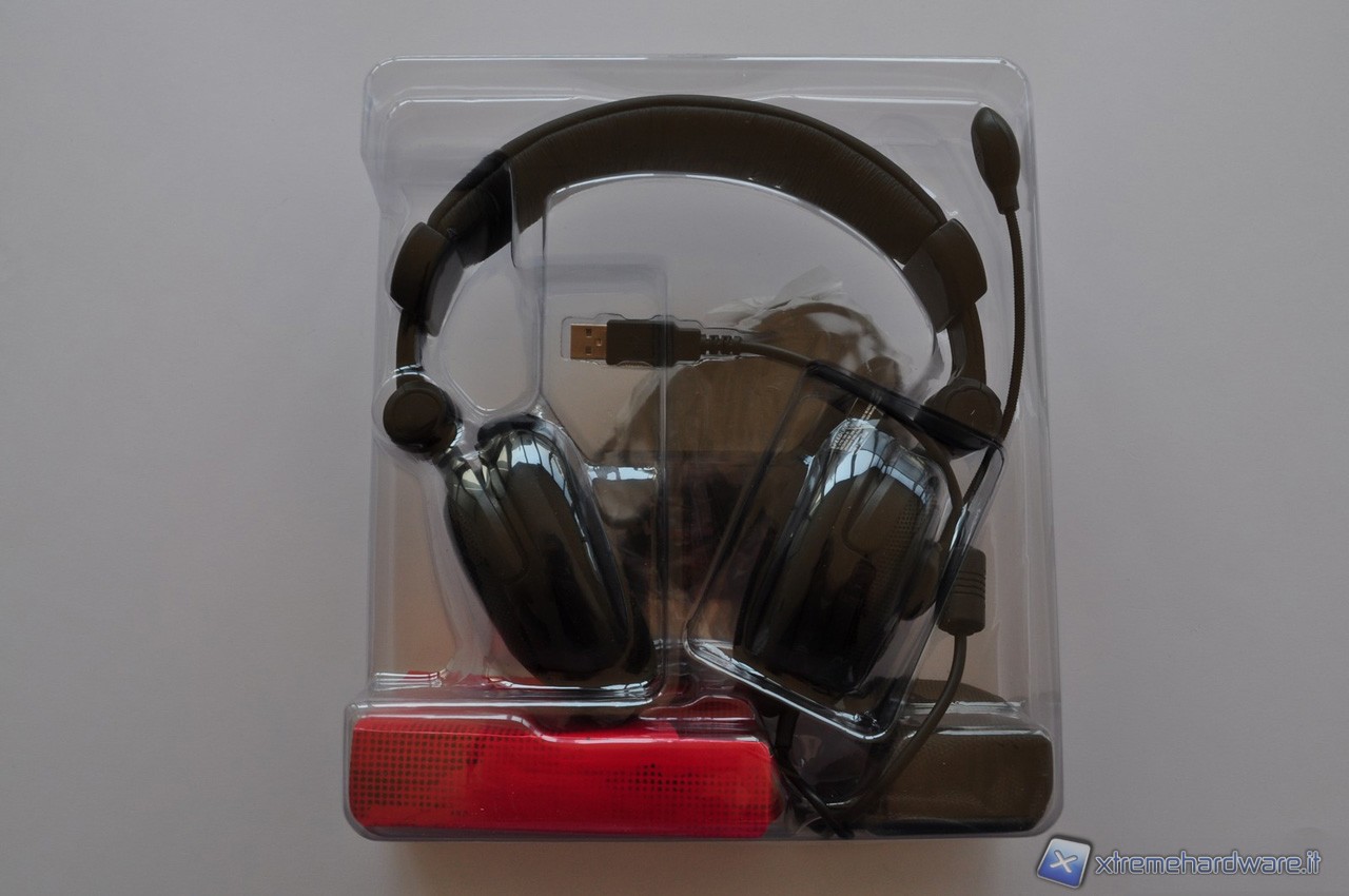 L’imballaggio è dalle dimensioni piuttosto generose, precisamente di 300 x 240 x 100 mm (che sono rispettivamente altezza, larghezza e profondità), e assolutamente adeguate per contenere in maniera appropriata questo voluminoso prodotto ed il suo completo bundle. Le cuffie vengono, infatti, vendute con un CD contente i driver, un manuale per l’installazione rapida in molte lingue differenti (tra le quali c’è anche l’italiano) ed una praticissima borsa per poter permettere un agevole trasporto delle cuffie. Quest’ultimo è un gradito accessorio da parte di tutti i gamers che non vogliono separarsi dal proprio equipaggiamento durante le trasferte in casa di amici o in veri e propri LAN party.