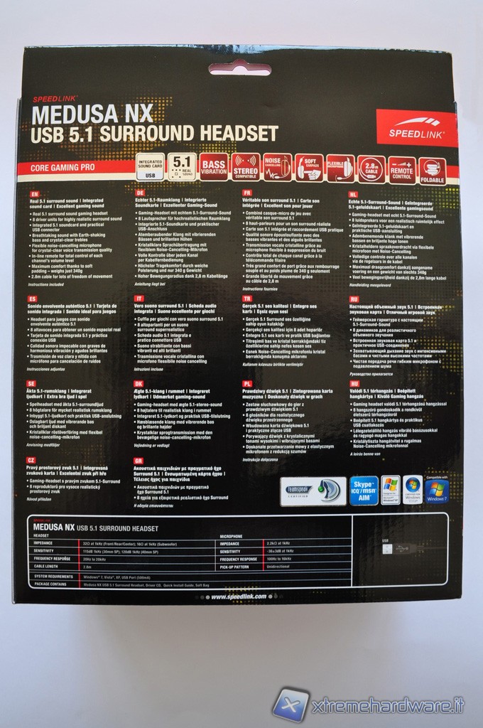 La confezione riporta in maniera molto chiara e piuttosto dettagliatamente tutte le caratteristiche del prodotto, enfatizzando in maniera particolare il vero suono surround 5.1 gestito dalla scheda audio integrata.