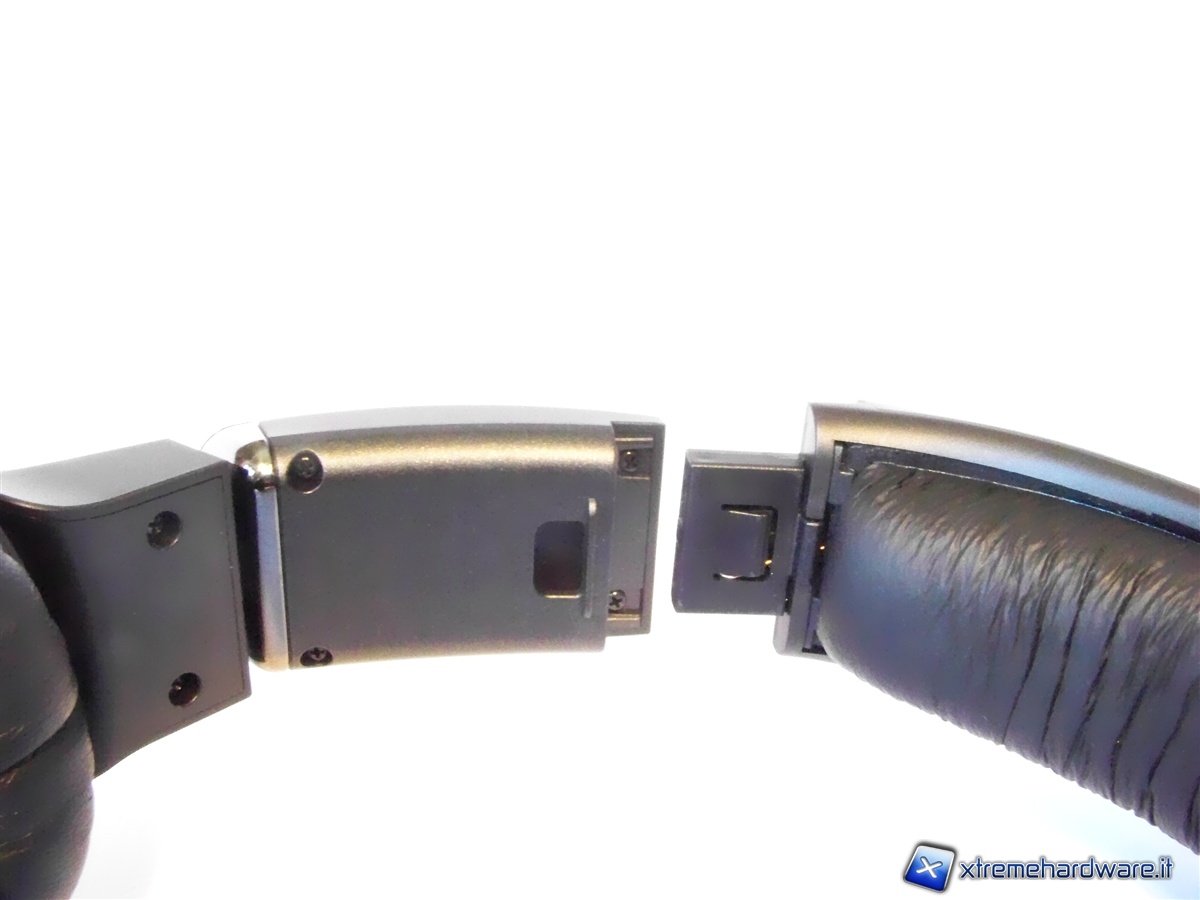 Accanto al punto di regolazione ed alla fine del cerchietto superiore possiamo trovare due clip, una per parte, atte alla rimozione dei padiglioni acustici effettuabile applicando un po’ di forza sulla clip stessa.