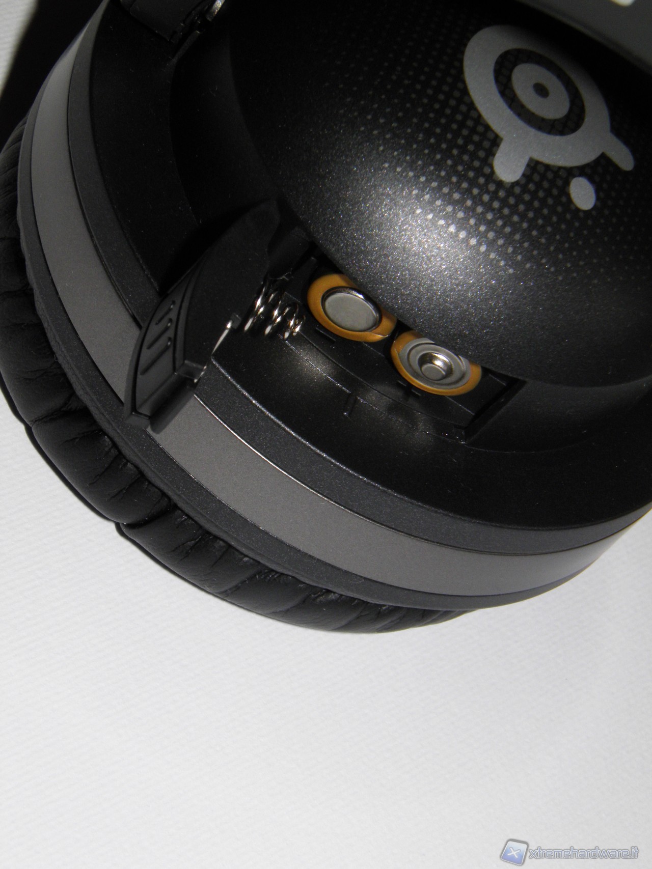 Sempre nella parte destra vede l'alloggio per le due pile di tipo AAA (mini stilo) che dovrebbero garantire circa 20 ore continue di musica (l'autonomia varia a seconda del volume). L'alloggio è posto nella parte superiore del padiglione, sotto l'inizio dell'archetto di unione dei due estremi.