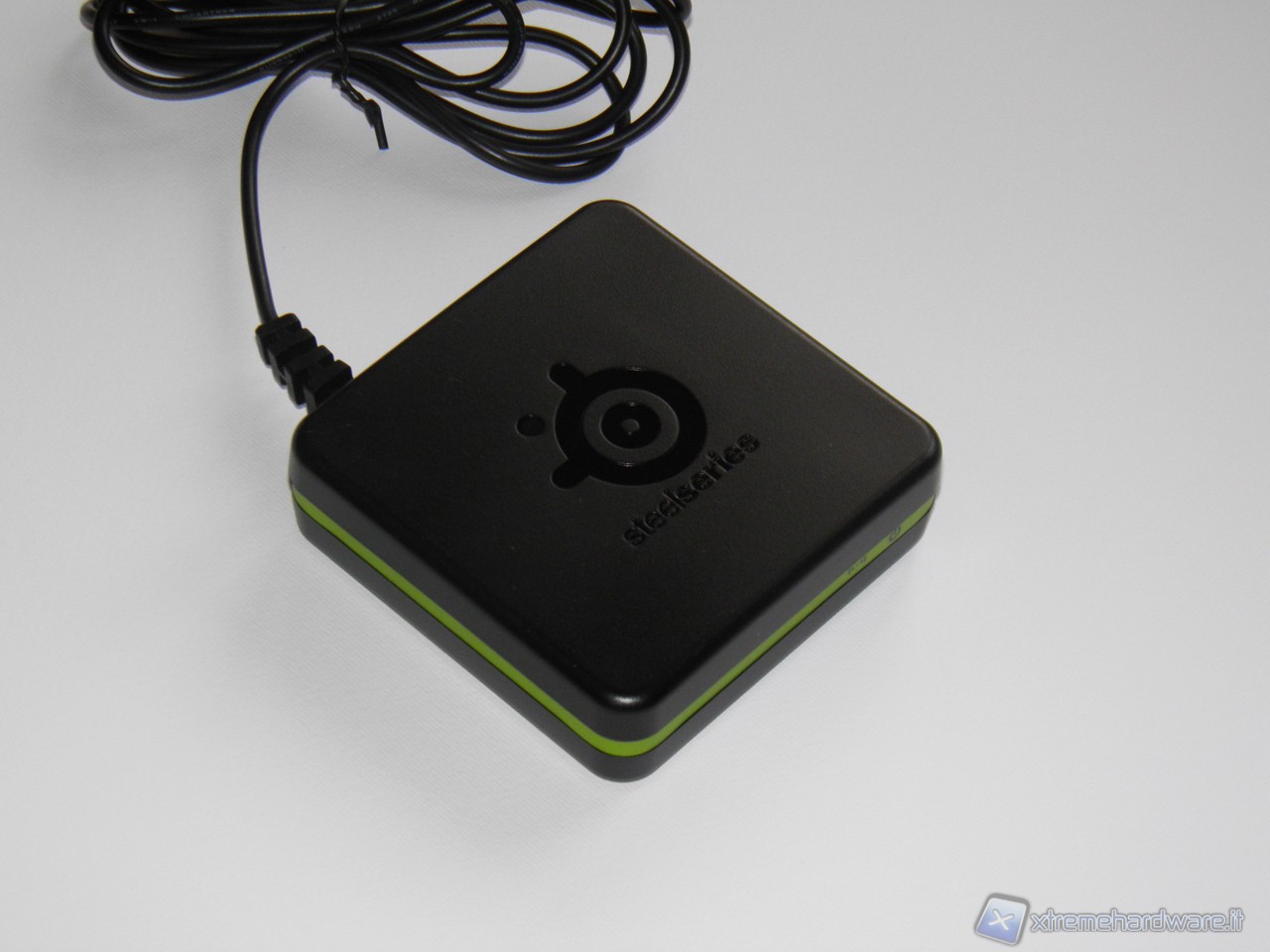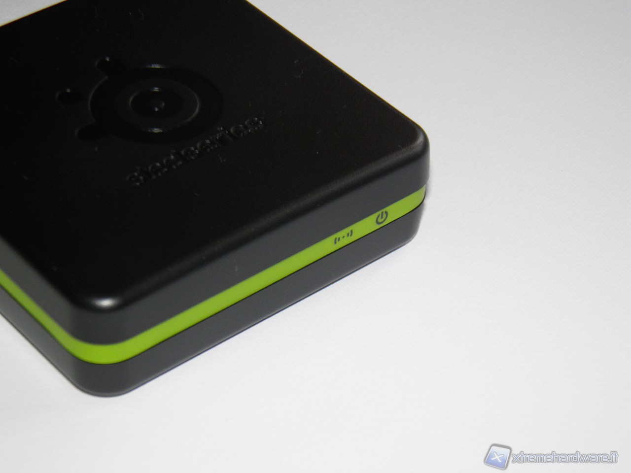 Il ricevitore è ,invece, realizzato con una plastica bucciata nera, sulla parte superiore la fa da padrona il logo SteelSeries. Una linea verde centrale riprende i colori della XBOX.