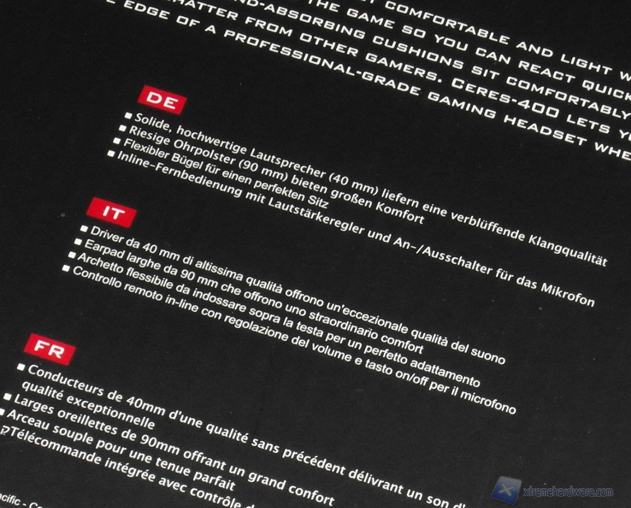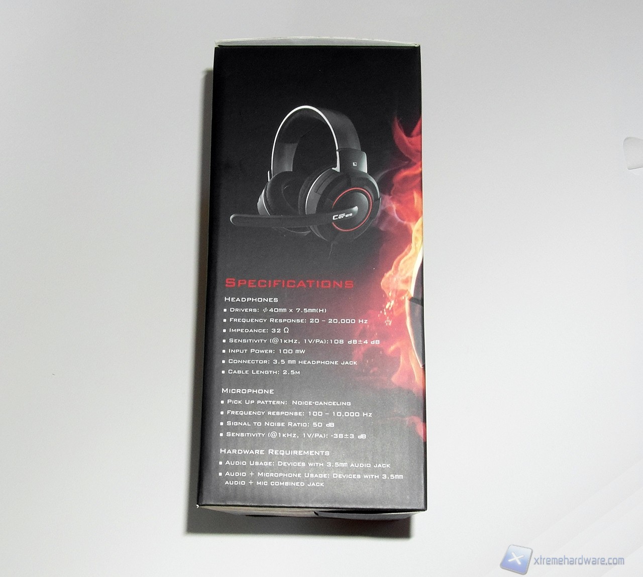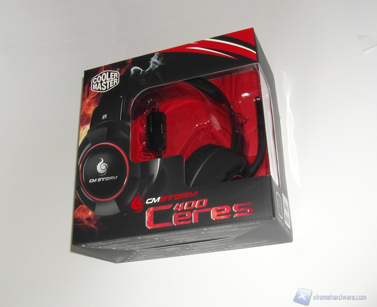 La confezione delle CM Storm Ceres 400 è molto simile a quella delle Sonuz. Nella parte frontale, il cui stile e colori sono ormai inconfondibili, tra nero e fiamme troviamo in primo piano il controllo in-line per volume audio e microfono. La parte sinistra della confezione presenta l'immagine dell'headset, mentre sulla destra la plastica trasparente ci permette di visionare direttamente il lato sinistro delle cuffie, caratterizzato dalla presenza del microfono.