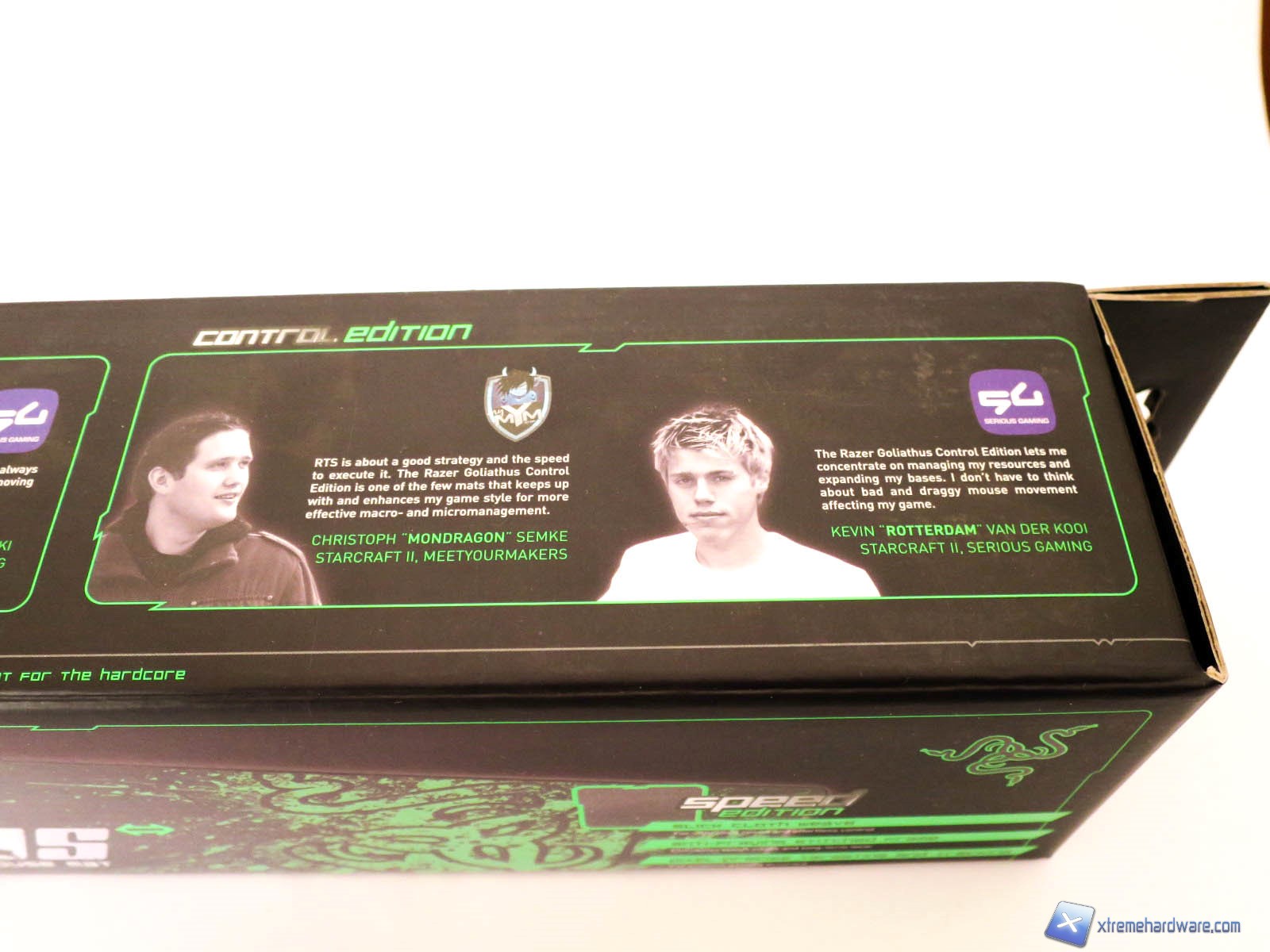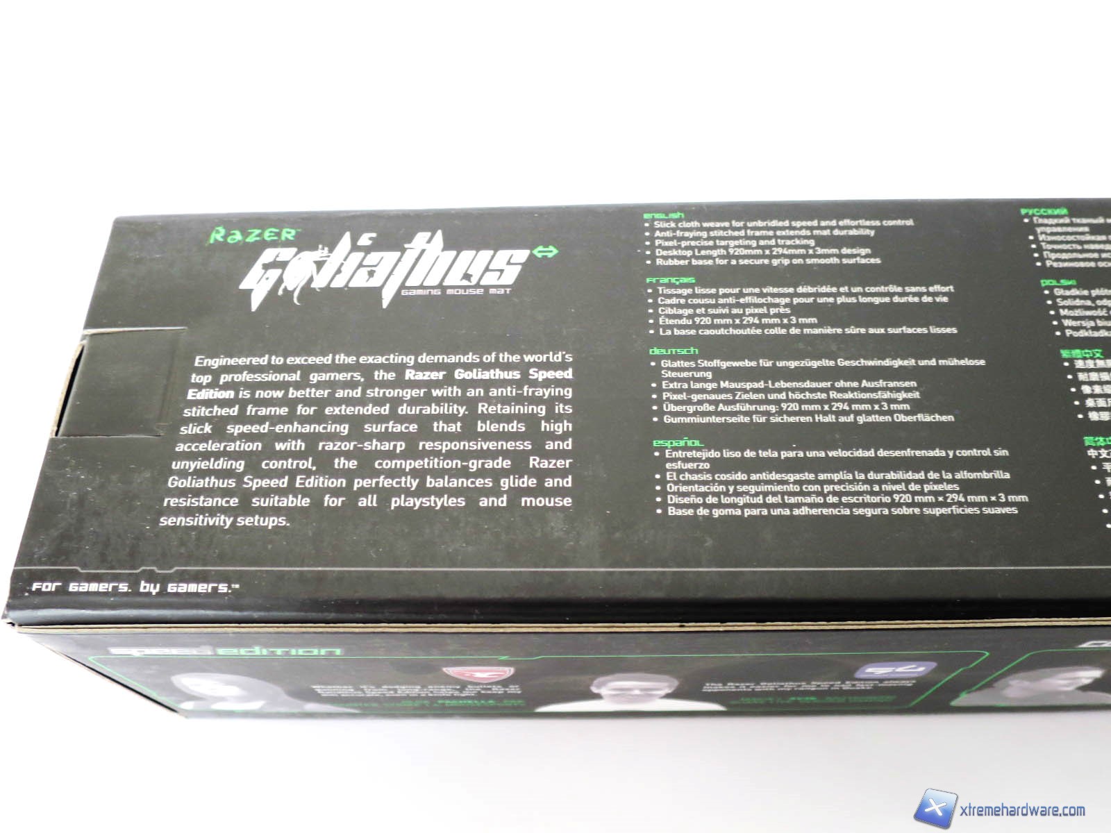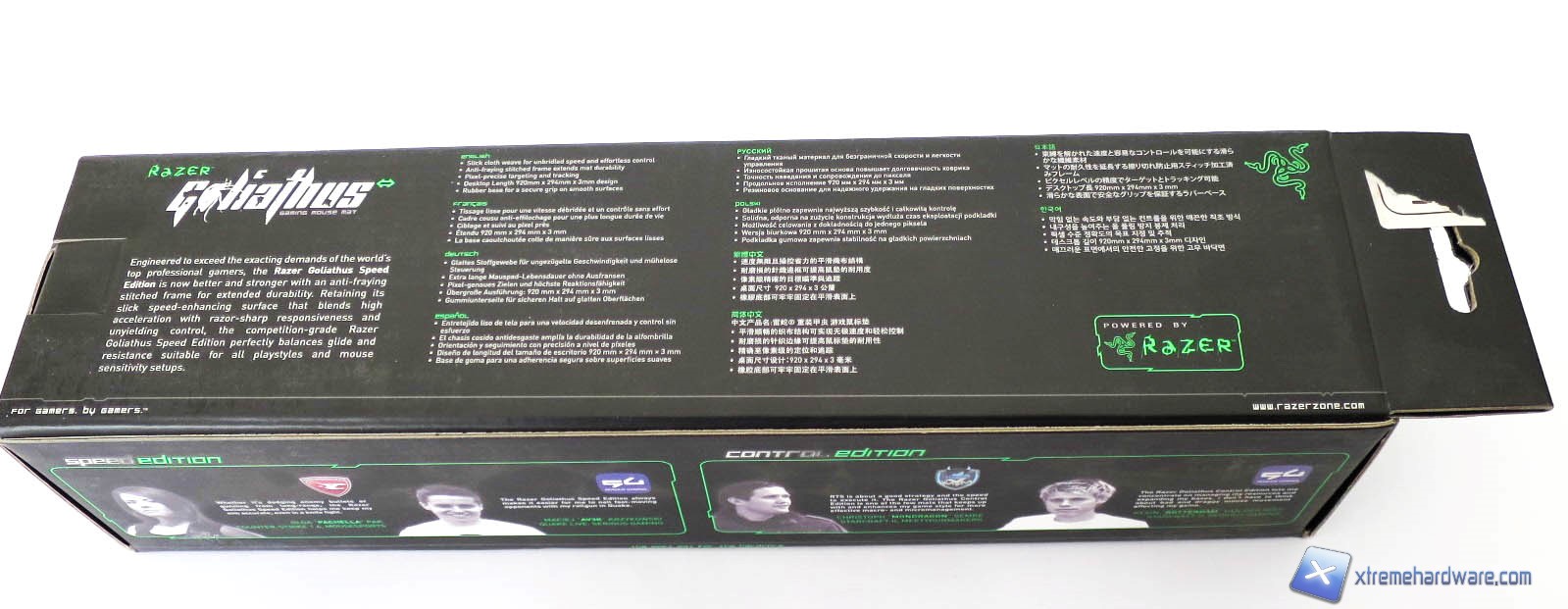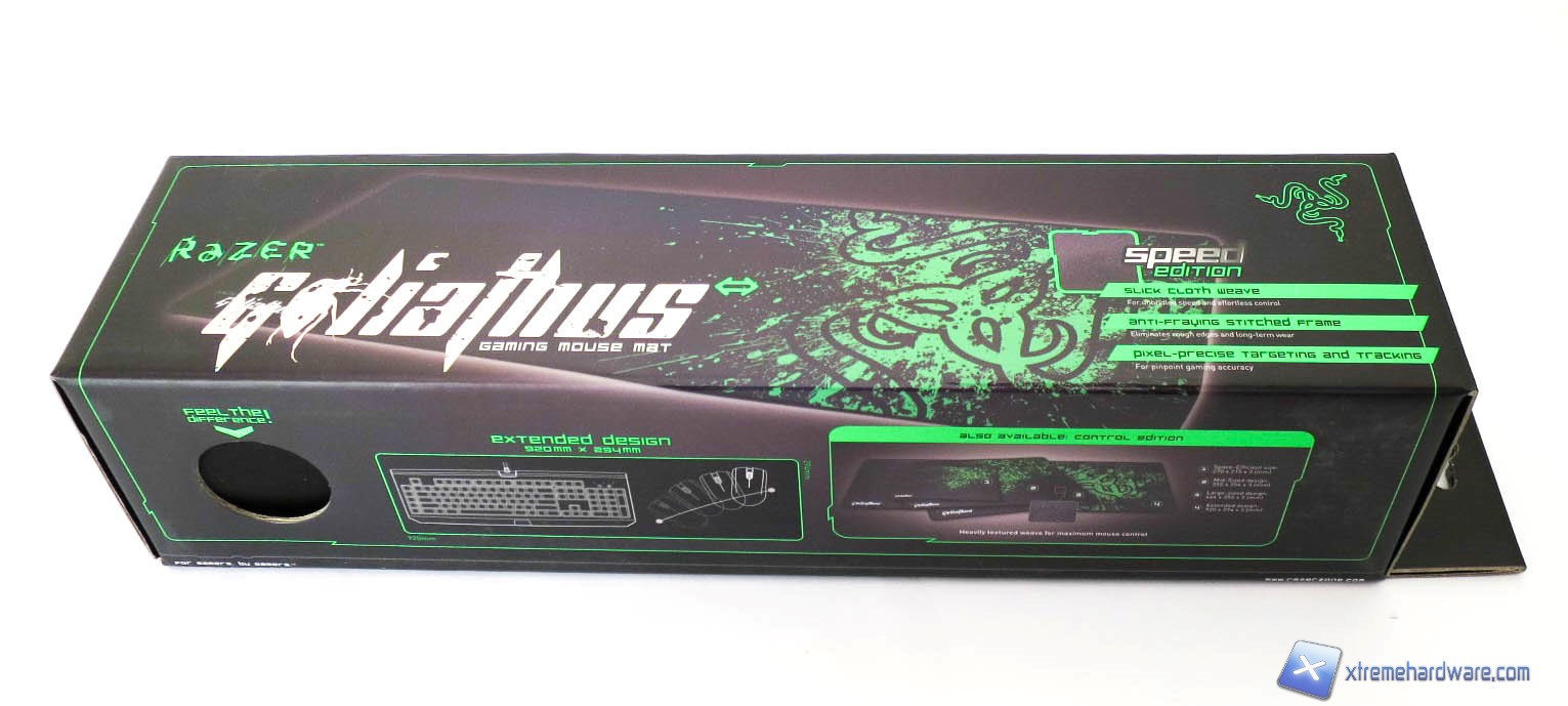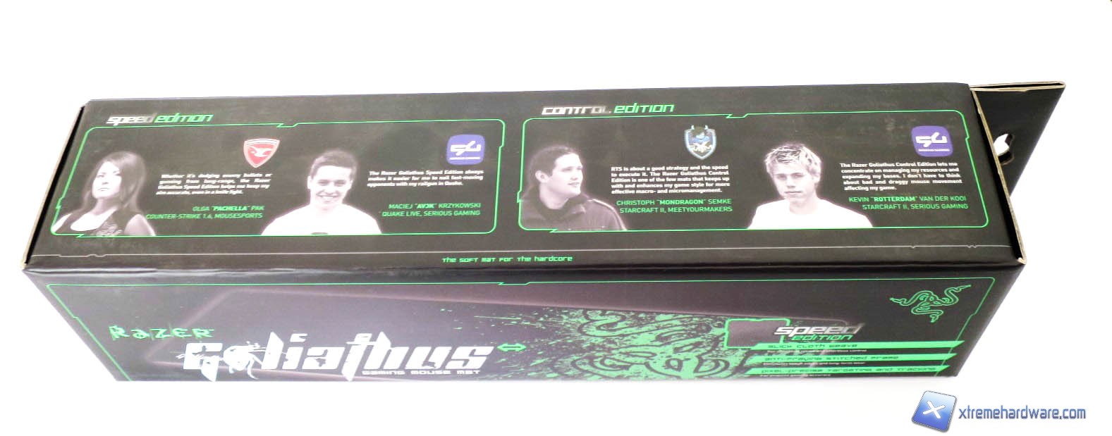 Anche per il mousepad abbiamo una confezione di cartone sulla quale sono riportate tutte le informazioni relative al prodotto. Notiamo come in tutti i lati siano presenti varie immagini illustrative, le caratteristiche tecniche del mousepad ed alcuni testimonials. Sulla confezione non mancano anche riferimenti alle altre dimensioni disponibili del Goliathus.