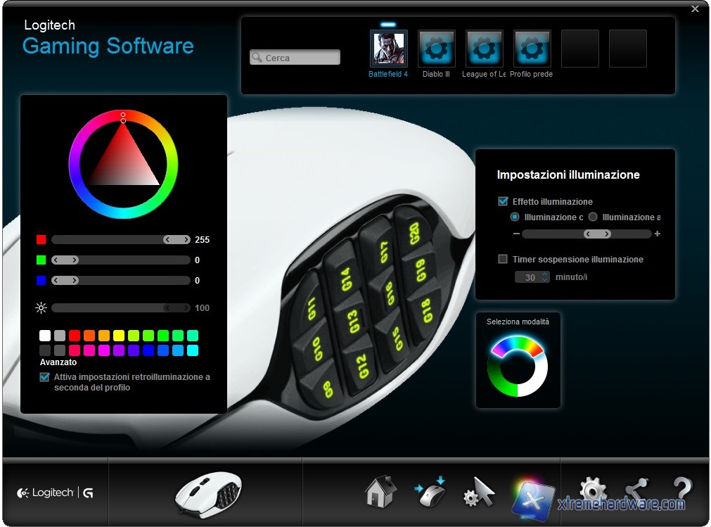 Passiamo ora alla caratteristica estetica di più rilievo del Logitech G600 ovvero la retroilluminazione dei tasti G. Dal software Logitech potremo sbizzarrirci con i vari settaggi di colore o funzione. Di default il Logitech G600 viene fornito con un’impostazione di Color Loop e modalità pulsante con velocità media. Potremo comunque variare la velocità della retroilluminazione o cambiare ancora la modalità da pulsante a statica ed eventualmente eliminare il Color Loop settando un singolo colore di nostro gradimento. Potremo sceglierlo dai pattern disponibili o agire sul range color trovando un colore particolare. Anche se i colori sono dati in un range 1-16 milioni è davvero difficile ottenere un colore particolare come retroilluminazione. Logitech come sempre cerca dei metodi alternativi per cui, rispetto ad altri mouse, avremo una fedeltà cromatica leggermente migliore. Inoltre come vi avevamo anticipato potremo settare una determinata retroilluminazione ad un profilo di gioco in modo tale da renderci conto di quale profilo abbiamo caricato.
