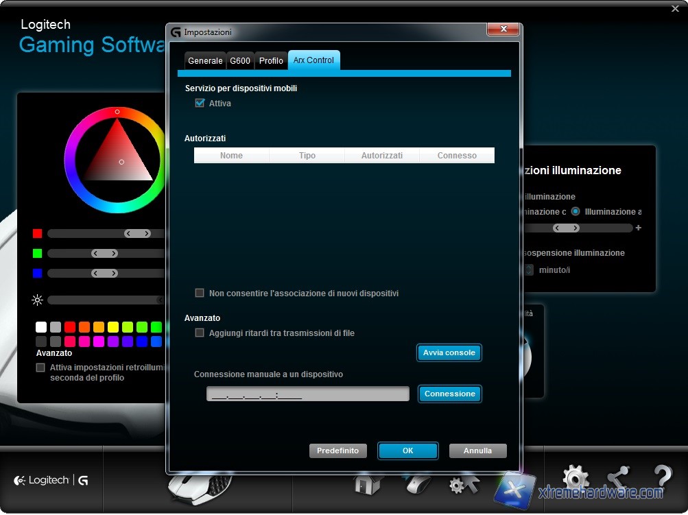 Infine dal Menù delle impostazioni potremo agire su alcune opzioni di avvio del programma, di gestione di colore e retroilluminazione a seconda del gioco, di controllare la disponibilità di un nuovo firmware o usufruire dell’Arx Control tramite smartphone.