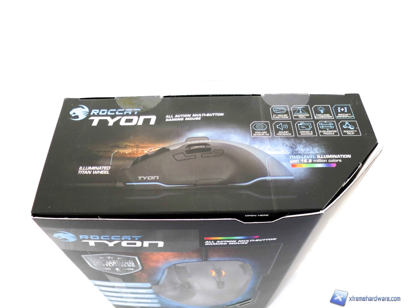 Il Roccat Tyon come ogni altro prodotto di Roccat, come abbiamo visto pochi giorni fa con le Kave XTD Stereo, è ricco di informazioni e immagini stampate in ogni lato della confezione. Ovviamente potremo visualizzare il mouse all’interno della confezione tramite una classica apertura a libro che celerà nel lato sinistro ulteriori informazioni.