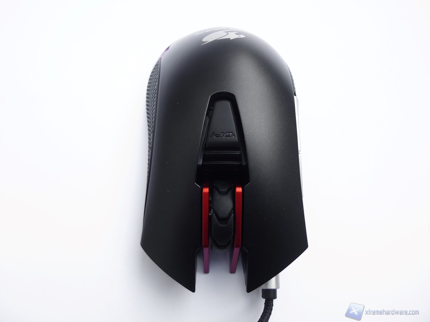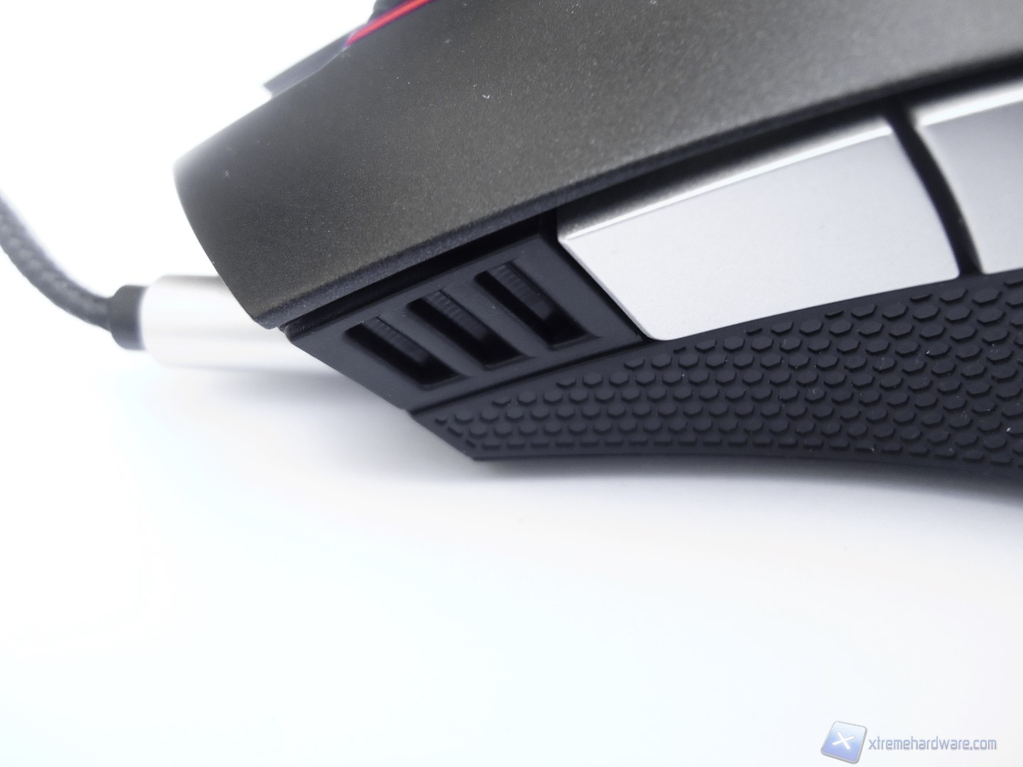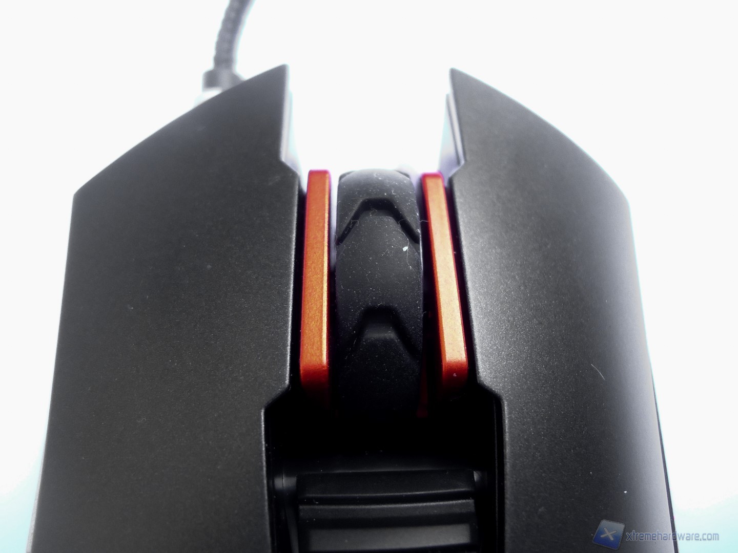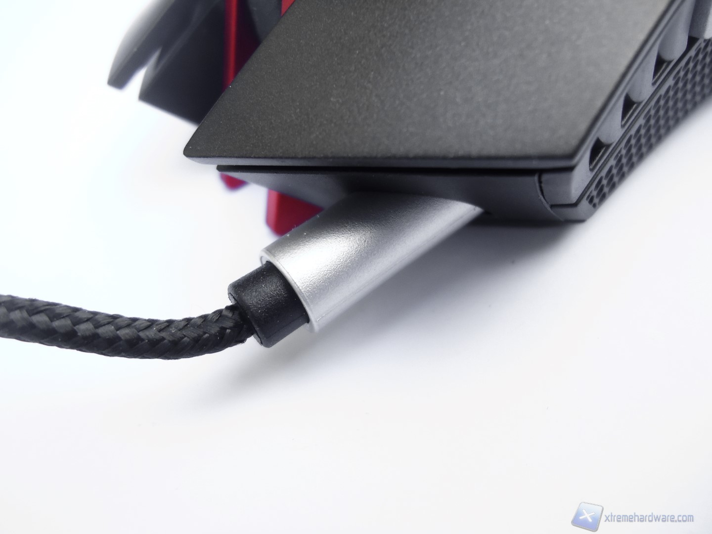 La parte frontale del mouse si distingue per un design davvero aggressivo e dalla presenza, oltre che dei tasti descritti fino ad ora, del connettore da dove si estende il cavo USB rivestito in treccia di tessuto.