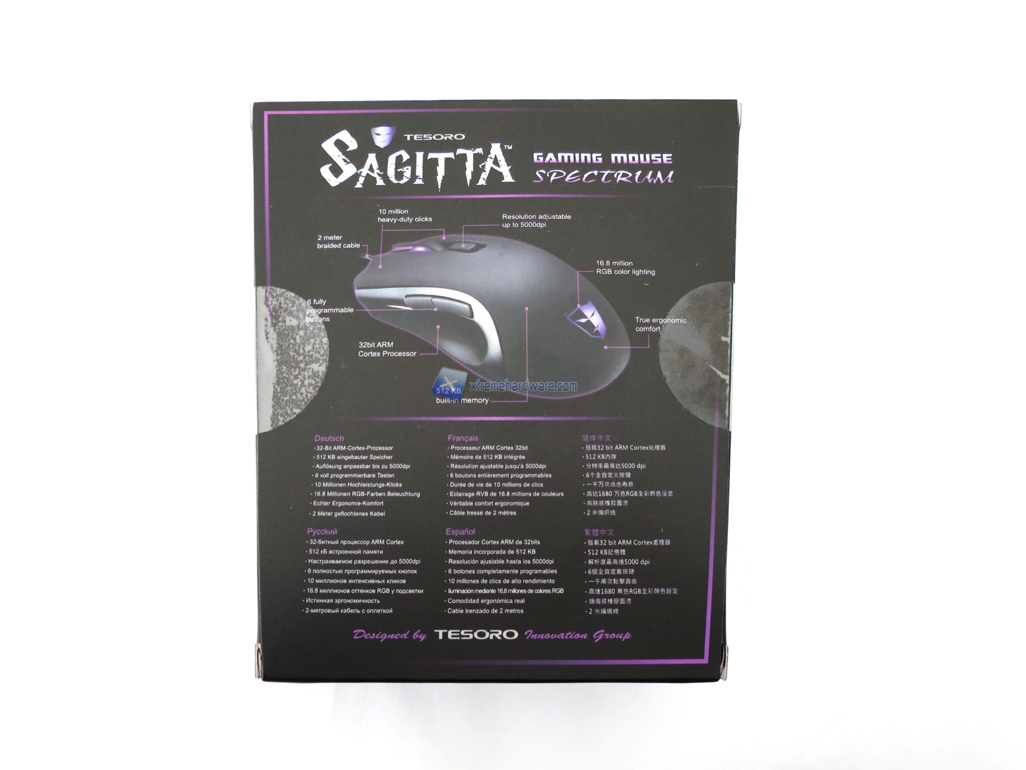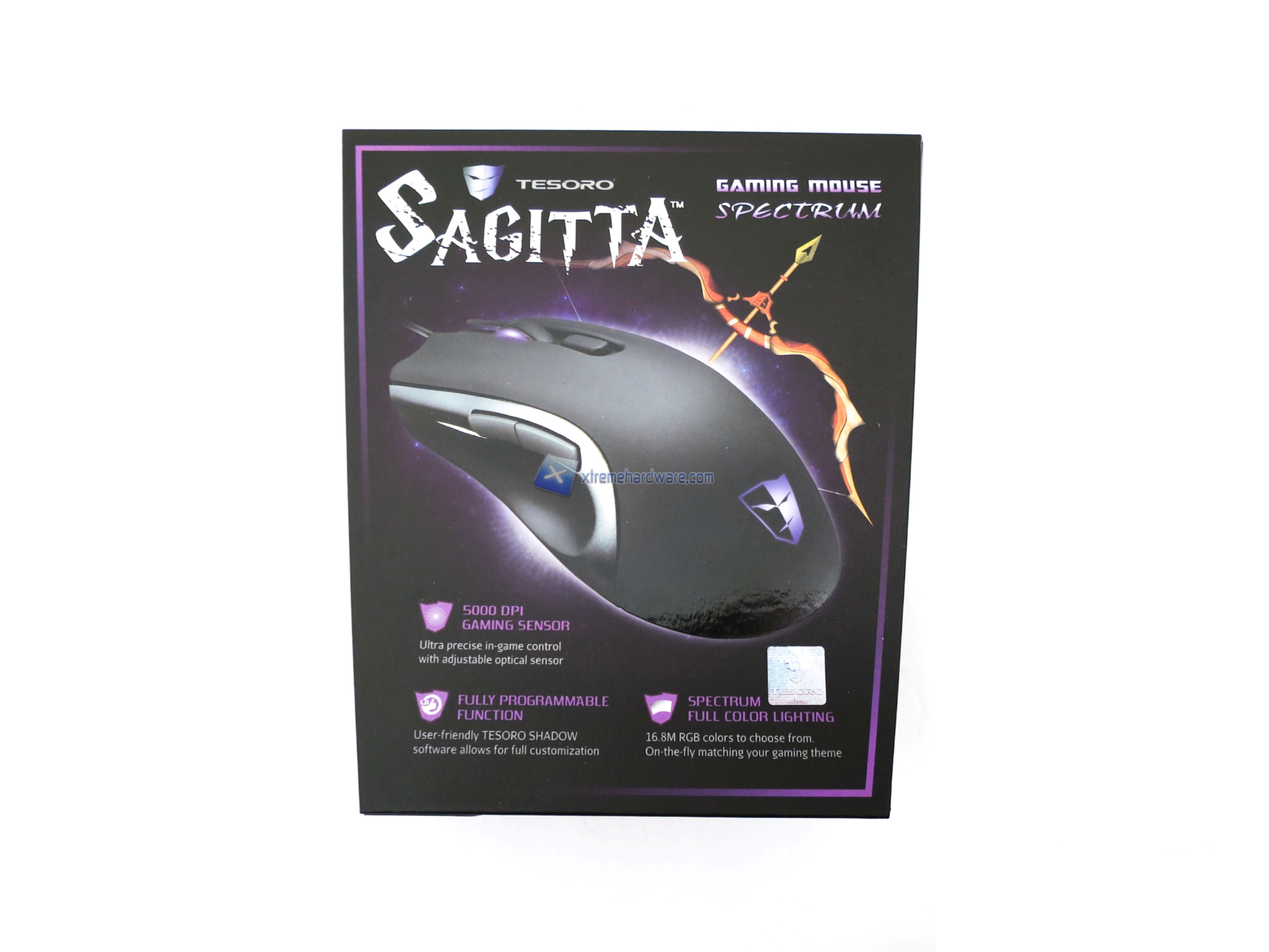 Il packaging dei prodotti Tesoro ed in particolare dei mouse non cambia ed infatti abbiamo sempre una confezione in cartone di colore viola con una forma trapezioidale che dovrebbe ricordare il logo del brand stesso. Sulla confezione vengono riportate tutte le maggiori caratteristiche e specifiche insieme ad alcune immagini illustrative.