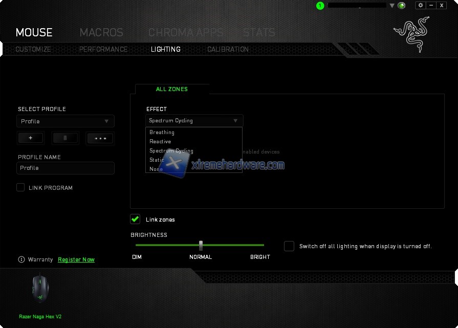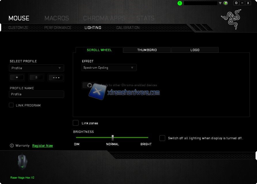 Arriviamo a ‘’Lighting’’ dove potremo impostare un singolo colore o diversi effetti. Per il Naga Hex V2 potremo ‘’legare’’ la retroilluminazione a tutte le zone o impostare un colore diverso per il logo Razer, per la rotellina e per i tasti/Thumbgrid nel lato sinistro. Impostabile anche e inoltre l’intensità della retroilluminazione.