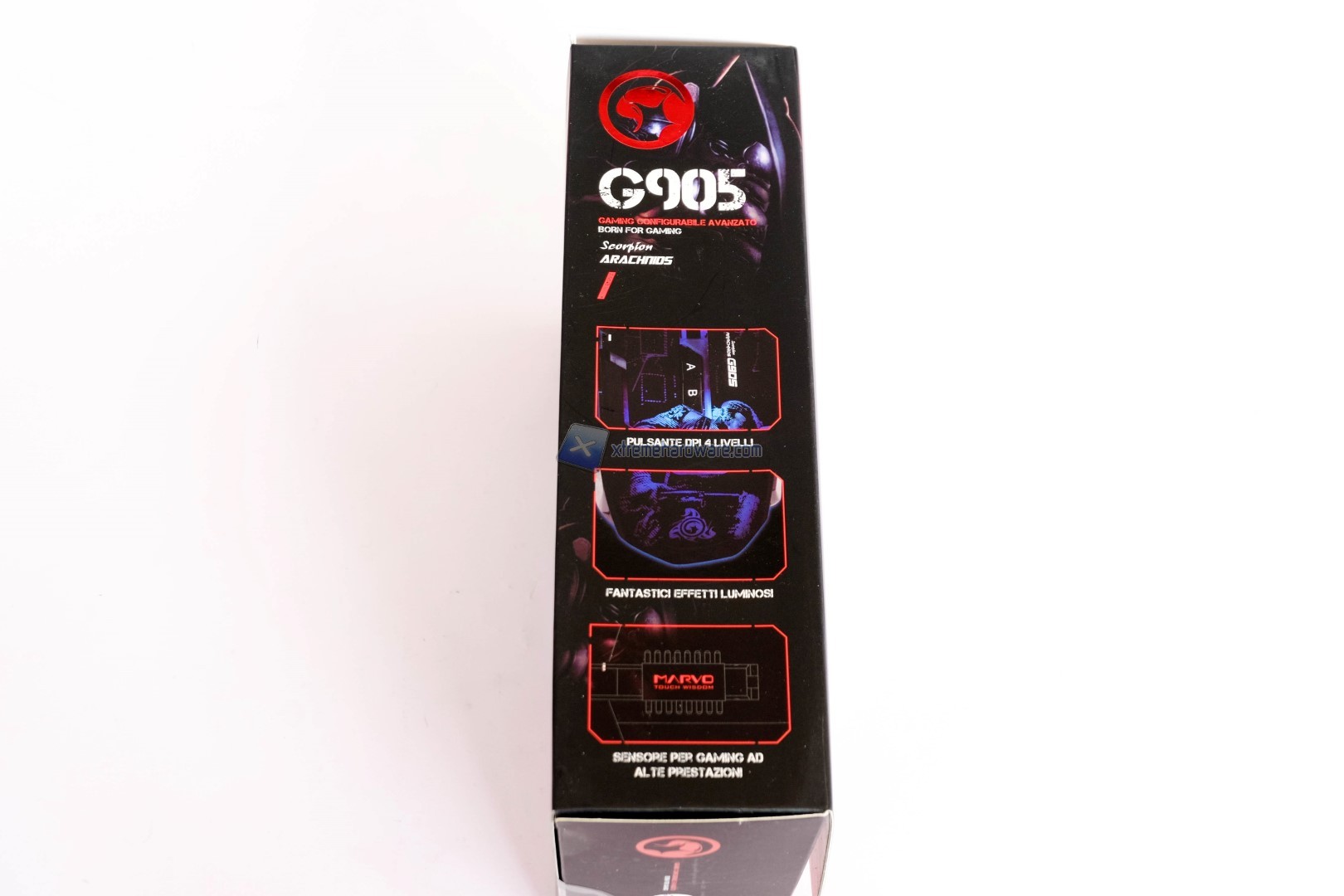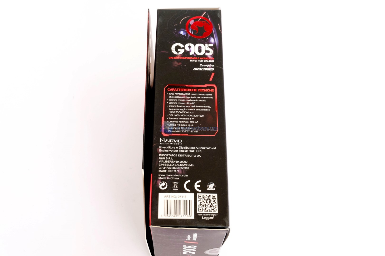 Anche i lati della scatola riportano informazioni utili, infatti sul lato destro e sinistro sono elencate le varie caratteristiche tecniche e alcune rappresentazioni dettagliate del prodotto. Il bundle che accompagna il G905 non è molto corposo, infatti sono presenti solamente il CD-Driver e un manuale di installazione rapida.