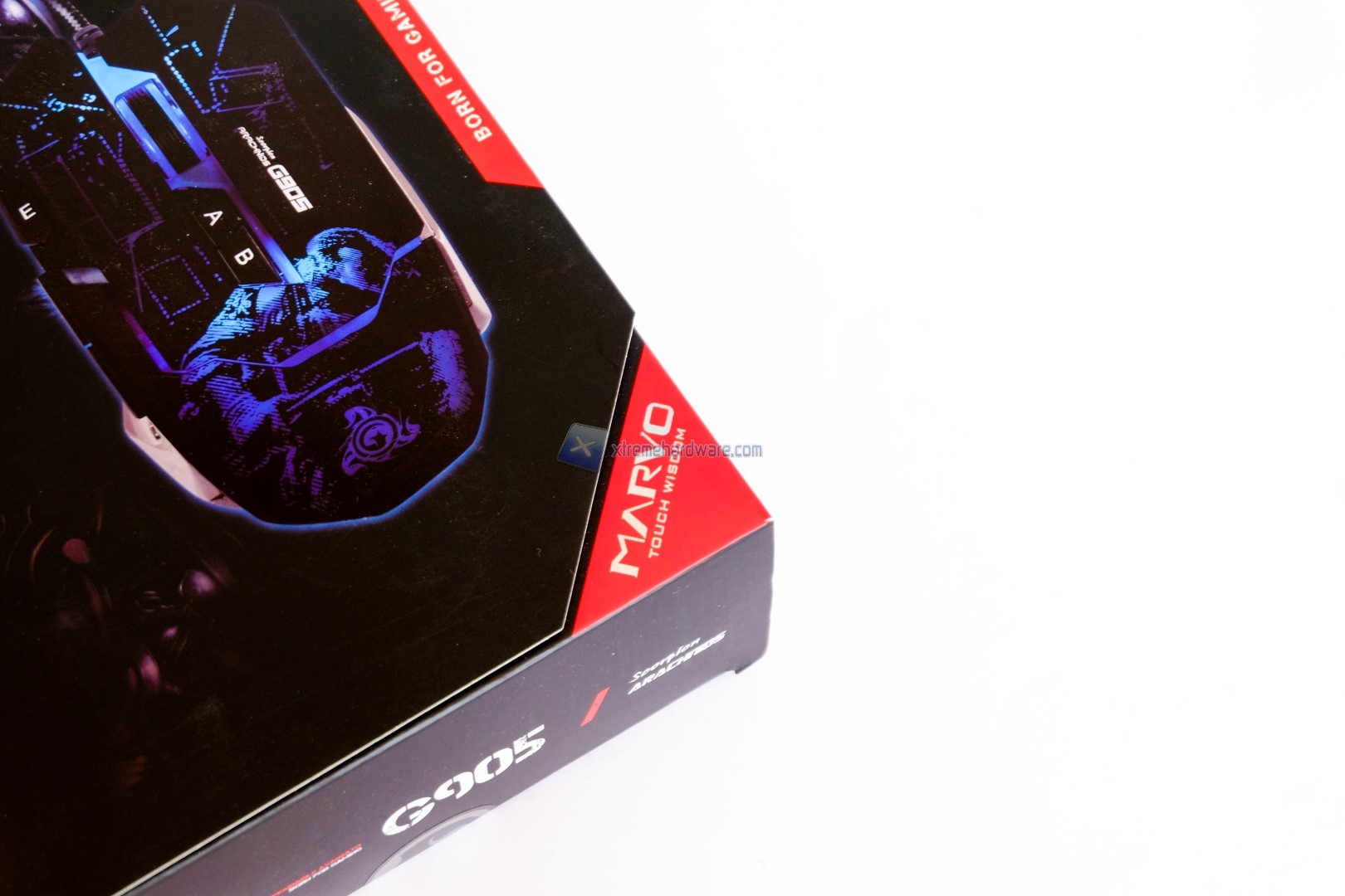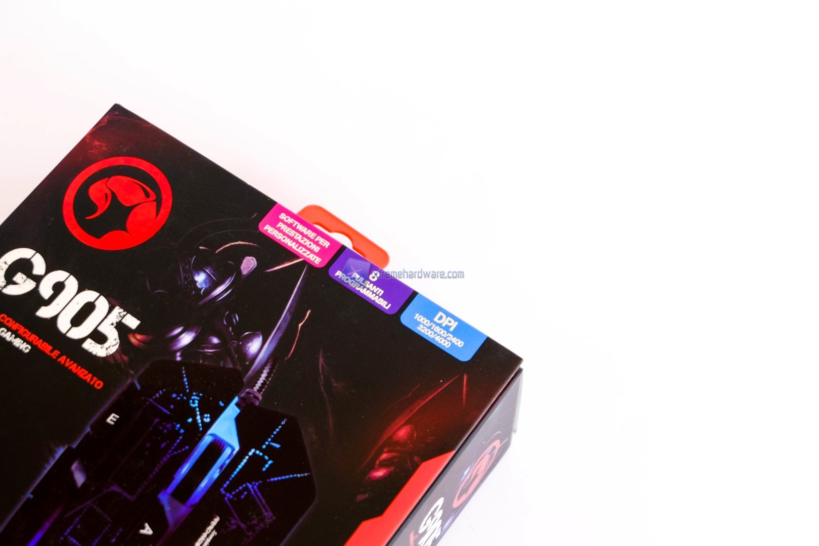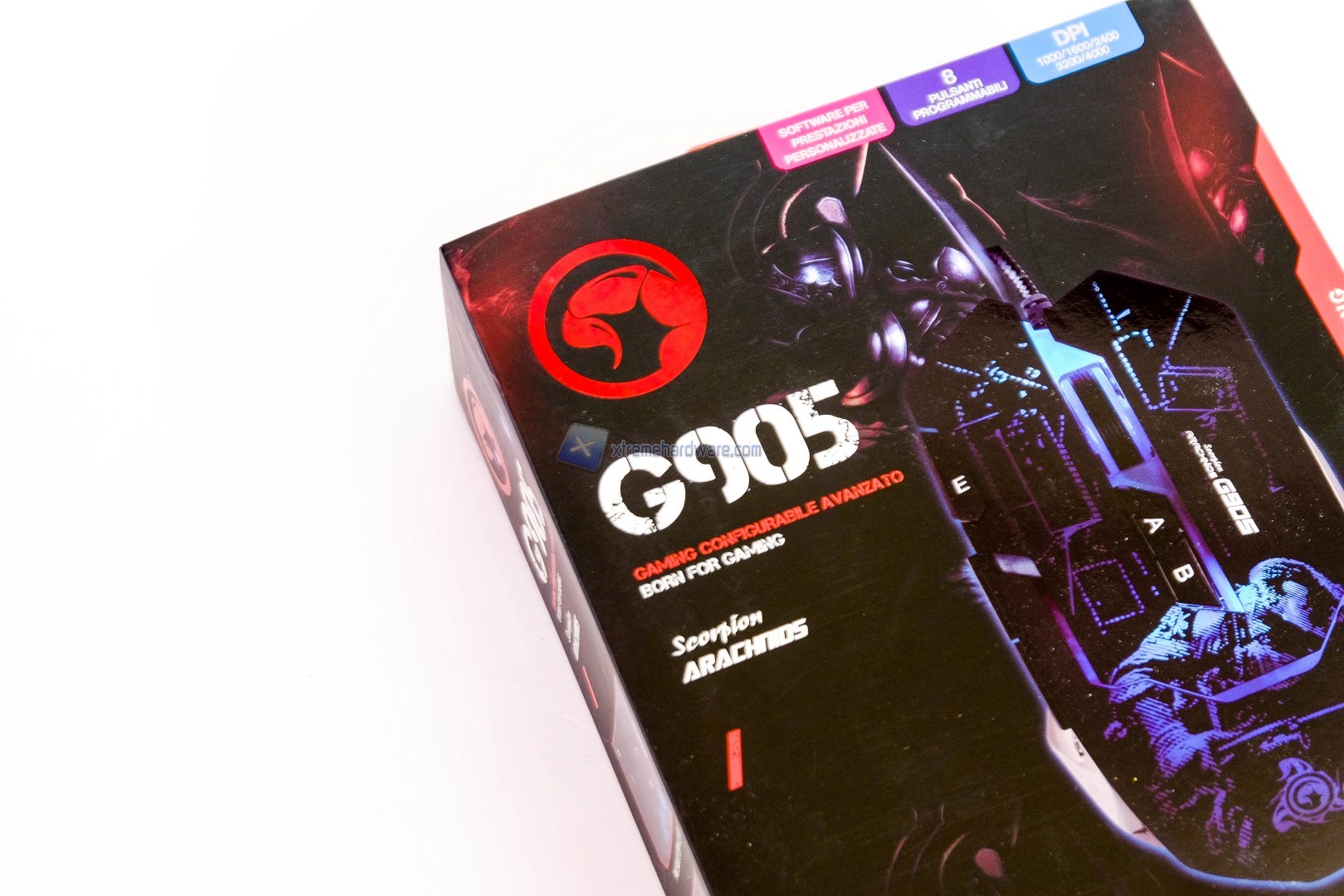 La confezione del G905 è la classica confezione a libretto utilizzata per questa tipologia di prodotti, quindi sulla facciata è presente una grande immagine del prodotto, accompagnata da vari bollini e diciture che specificano le sue caratteristiche. Aprendo la confezione notiamo sulla pagina sinistra un’ulteriore immagine del prodotto accompagnata da alcune didascalie esplicative, mentre sulla pagina opposta troviamo la periferica custodita all’interno di una protezione trasparente per consentire la visione del prodotto prima dell’acquisto.