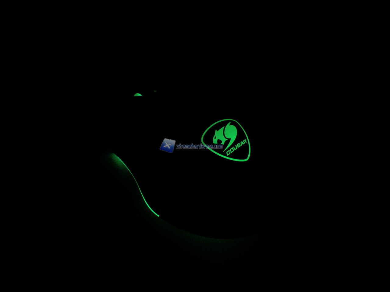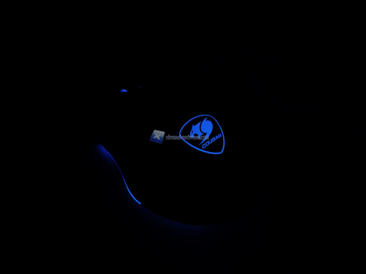 Iniziamo con un’analisi più da vicino e partiamo come sempre dalla zona superiore. Zona caratterizzata da una superficie in plastica liscia e in colorazione Grigio Scuro. Partendo dal dorso troviamo l’immancabile logo della Cougar che sarà la prima delle tre zone di retroilluminazione del mouse.