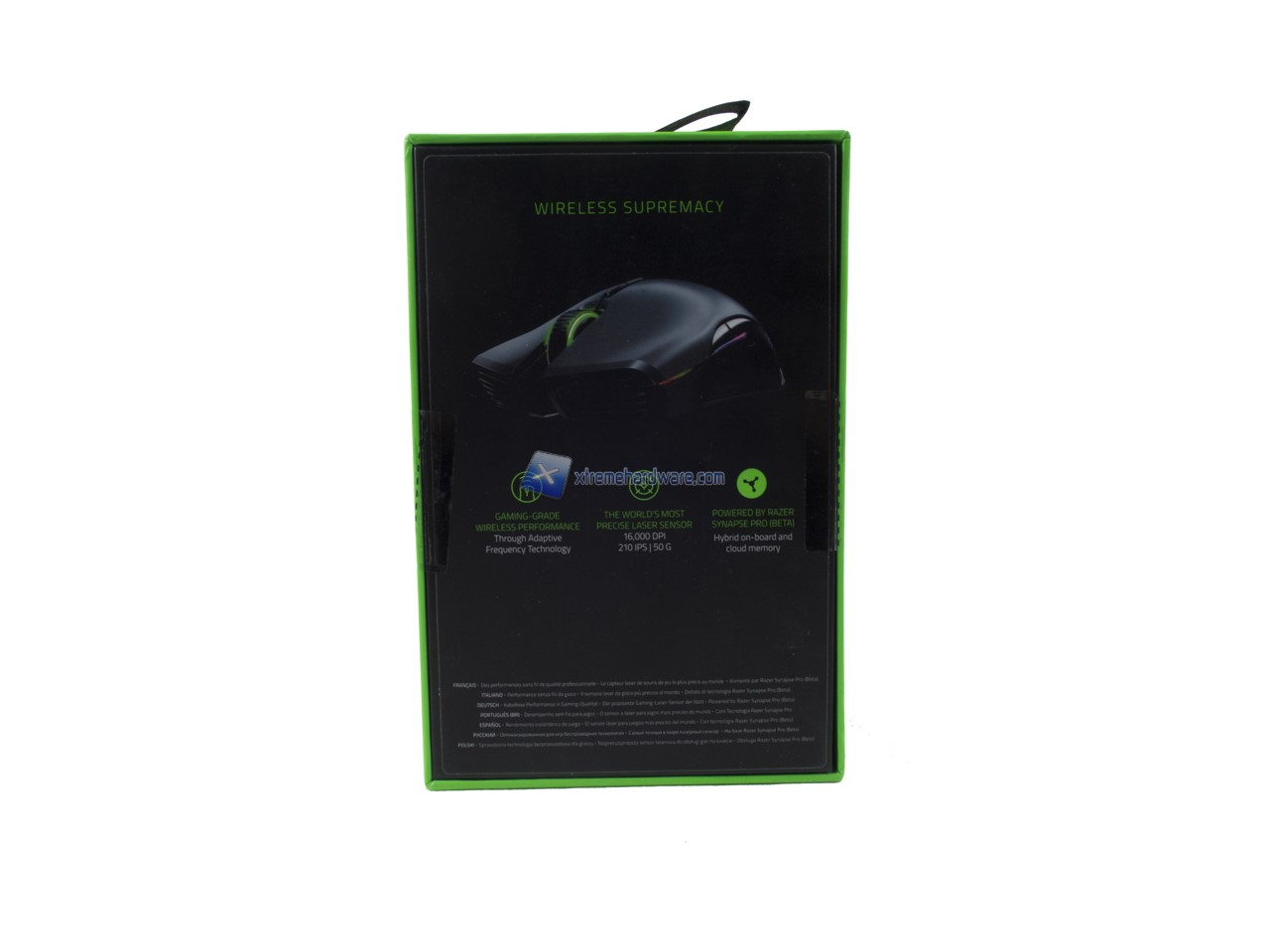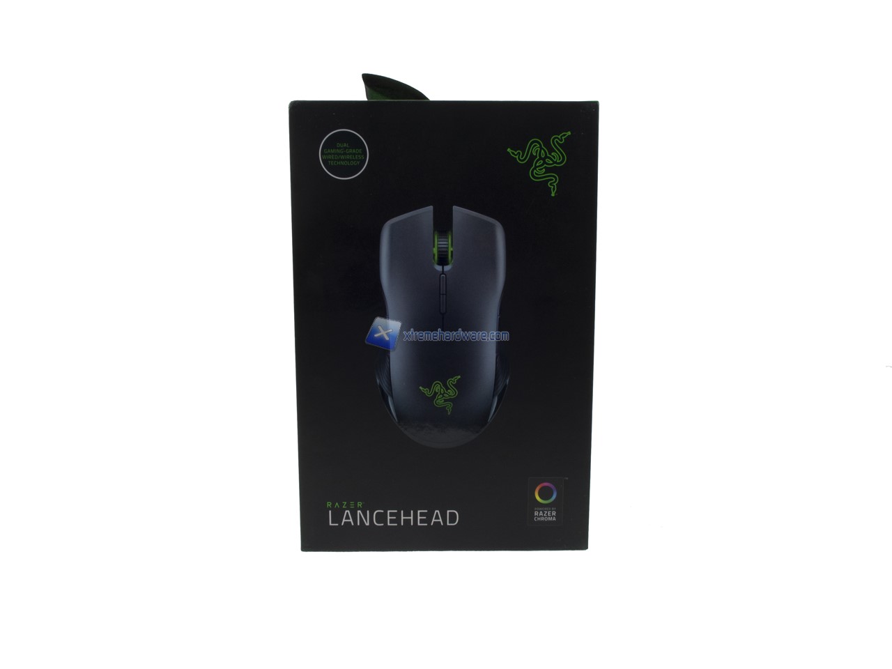 Il nuovo Razer Lancehead nella versione Wireless ci giungerà nell’oramai classica e rinnovata confezione Razer. Su di questa vengono riportate le principali caratteristiche e alcune immagini illustrative del prodotto.