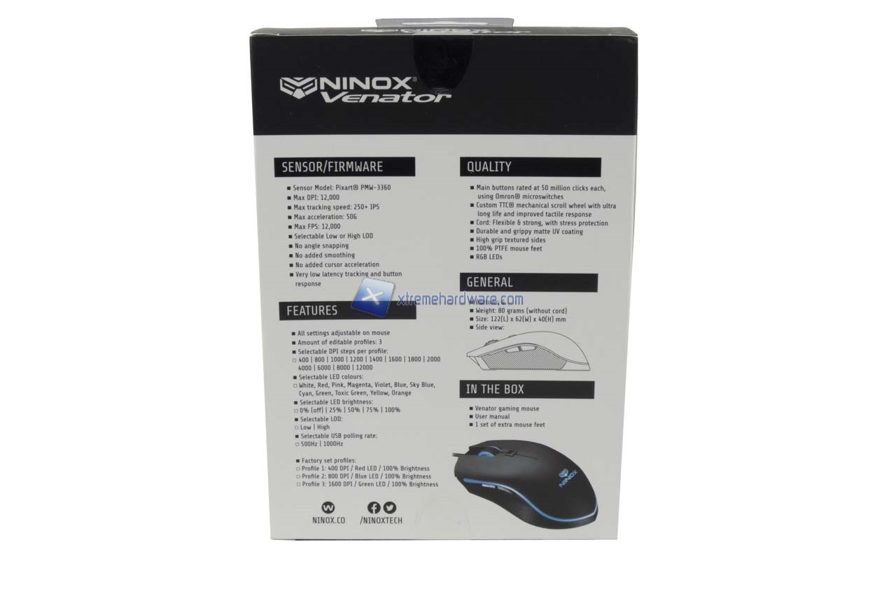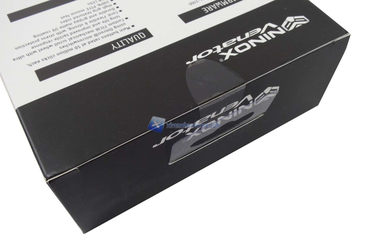 Il Ninox Venator sarà ospitato in una classica confezione di cartone a tema Nero e Bianco con un’apertura frontale in plastica trasparente da cui potremo prendere immediatamente visione del prodotto. Completano la confezione le diverse infomazioni e caratteristiche del prodotto sia nel lato frontale sia in quello posteriore.