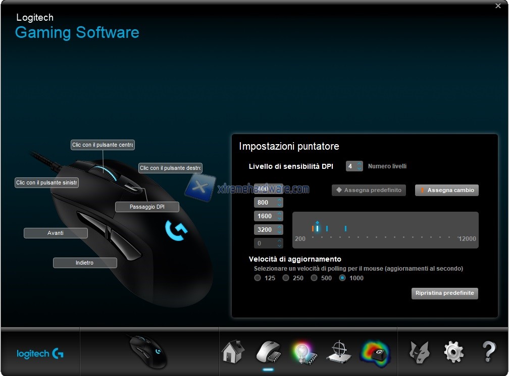 A seguire abbiamo l’icona del mouse che ci aprirà le porte della personalizzazione di profili DPI e assegnazione tasti. Logitech da sempre permette di attivare o meno tutti i profili e relativi DPI. Impostazione del Polling Rate presente.