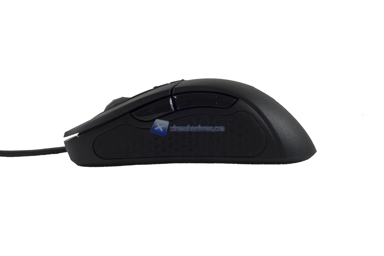 Passiamo ora al lato sinistro dove osserviamo una superficie gommata per migliorare il Grip e l’impugnatura del mouse oltre ai due tasti laterali che offrono dimensioni buone, seppur quello avanzato leggermente più piccolo dell’altro, e feedback valido.