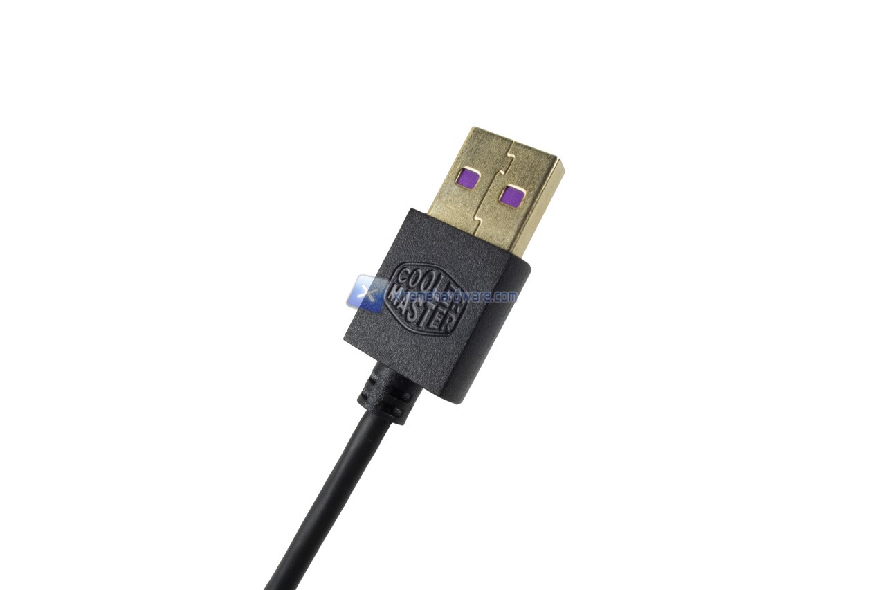 Nel dorso del mouse possiamo osservare il logo Cooler Master di cui il perimetro/contorno esagonale verrà retroilluminato di un colore a nostro piacimento o colore con effetto. E’ possibile inoltre notare già la superficie rugosa che migliorerà il Grip sul mouse stesso.