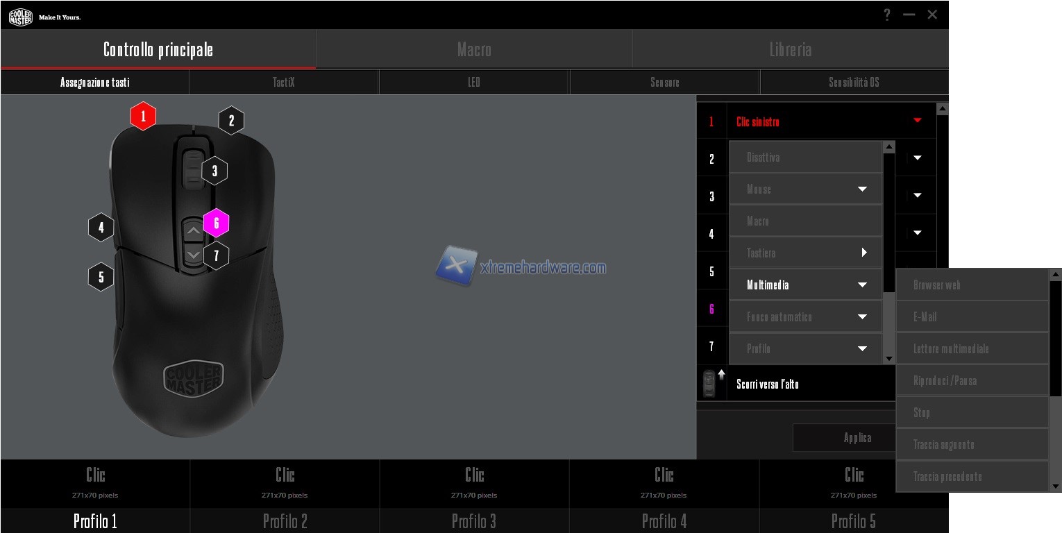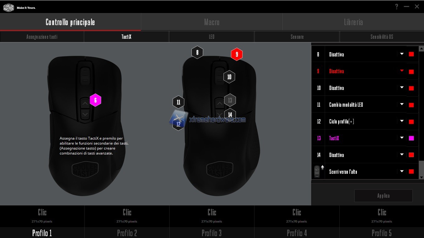 Nella parte alta abbiamo tre Menù principali che sono ‘’Controllo Principale’’, ‘’Macro’’ e infine ‘’Libreria’’ mentre nella parte bassa i 5 Profili cui potremo aggiungere anche delle icone per meglio distinguere l’utilizzo. Per la voce ‘’Controllo Principale’’ troviamo cinque SottoMenù che sono ‘’Assegnazione Tasti’’, ‘’TactiX’’, ‘’LED’’, ‘’Sensore’’ e infine ‘’Sensibilità OS’’. Diamo ora una breve descrizione di ciascuno.