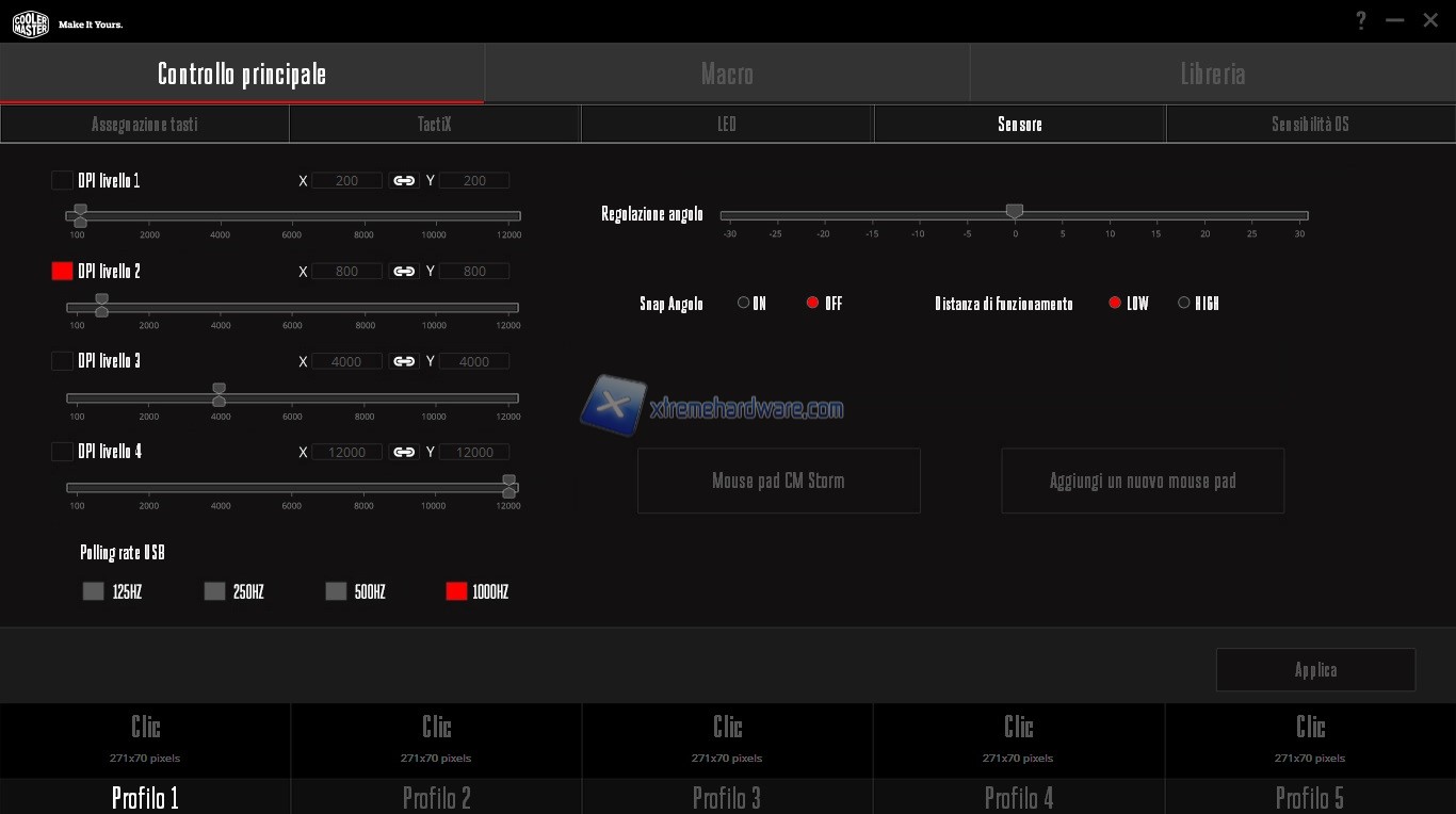 In ‘’Sensore’’ potremo creare i nostri Profili DPI regolando la risoluzione DPI con gli slider o manualmente scrivendo il numero che però potrà essere impostato solo di 100 alla volta. Potremo impostare anche il Polling Rate, il LOD, l’Angle Snapping e infine calibrare il sensore su uno dei diversi modelli di mousepad Cooler Master e non cliccando ‘’aggiungi nuovo mousepad.