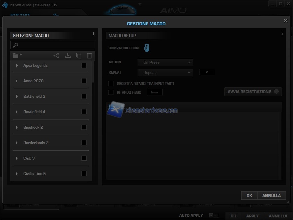 Con il ROCCAT Swarm potremo personalizzare i valori DPI, velocità dei click in Windows e non, calibrazione del LOD, gestione dell’illuminazione AIMO, gestione Macro (dotata di numerosi profili preesistenti), gestione Profili per il salvataggio nella memoria On-Board da 512KB del mouse e molto altro ancora. Vi lasciamo direttamente ai seguenti screenshots per comprendere meglio.