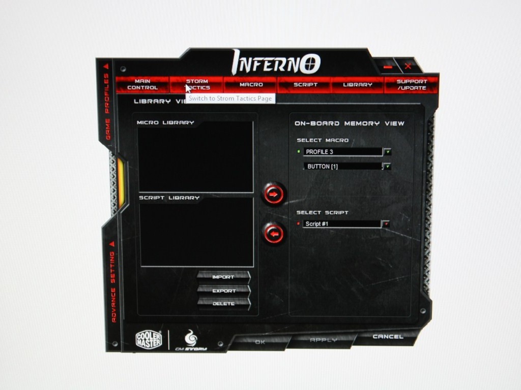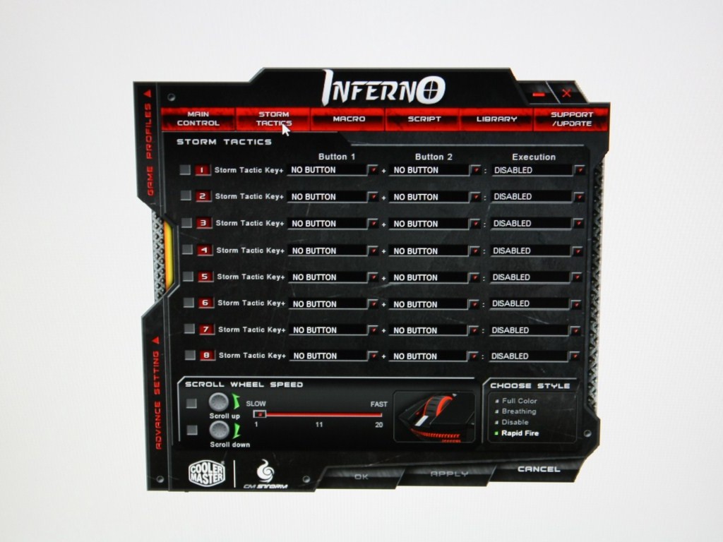 Innovativo il sistema Storm Tactics, con il quale l’utente più esperto potrà programmare fino a 32 mix extra di comandi, all’inizio la programmazione risulterà un po’ complessa, ma pian piano riusciremo a configurare il mouse sia per il gioco, nel quale potremo effettuare mosse speciali, combo etc., sia nell’utilizzo di programmi professionali.