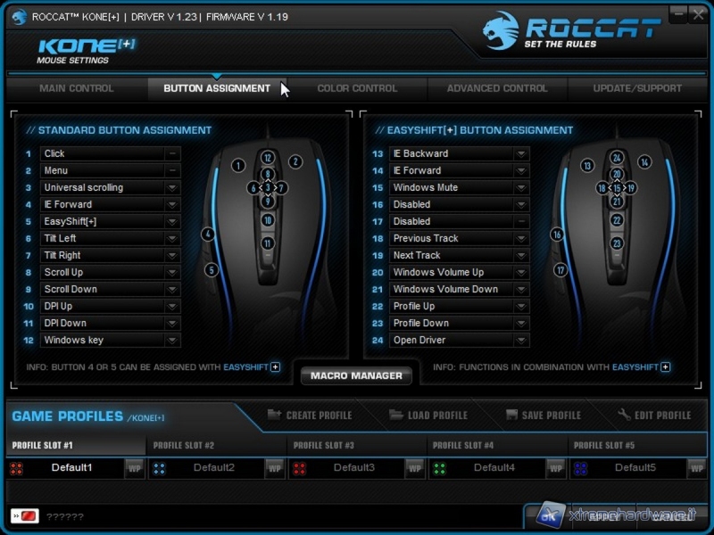 Il "kone mouse settings" è davvero un programma completo e semplice da utilizzare. Tramite di esso potremo andare a configurare ognuno degli 8 pulsanti presenti nel mouse (12 impostazioni possibili) ma non solo, duplicare tutte le funzionalità semplicemente utilizzando la funzione "easy-shift", che tramite la pressione del tasto shift (impostabile anche sul mouse stesso) ci consente di settare altre 12 impostazioni.